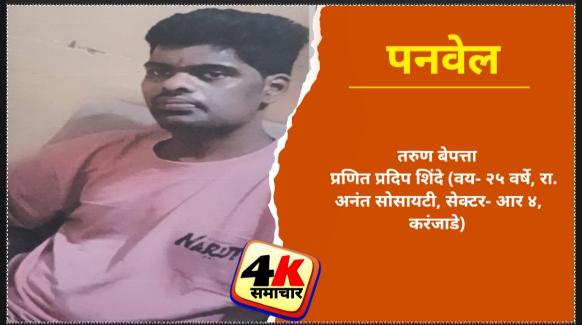 प्रणित प्रदिप शिंदे (वय- २५ वर्षे, रा. अनंत सोसायटी, सेक्टर- आर ४, करंजाडे) असून त्याची उंची ८ इंच अंदाजे, बांधा मध्यम, रंग-248 सावळा, चेहरा-गोल, केस-काळे जाड वाढलेले नाक मोठे बसके, अंगात नेसुन गुलाबी रंगाचा टी शर्ट, मिलीटरी रंगाची पॅन्ट, सोबत मोबाईल नेलेला नाही तसेच भाषा मराठी, हिंदी भाषा बोलता येथे. याबाबत कोणाला अधिक माहिती असल्यास त्यांनी पनवेल शहर पोलीस ठाणे, नवी मुंबई संपर्क क.८६५५३५४१११ वर किंवा तपासी अमंलदार एस.आर. जाधव मोबा नं. ८०९७१७८०६६ किंवा प्रदिप शिंदे, मोबा नं. ८६६८४८१६६८ वर संपर्क साधवा असे आवाहन करण्यात आला आहे.
