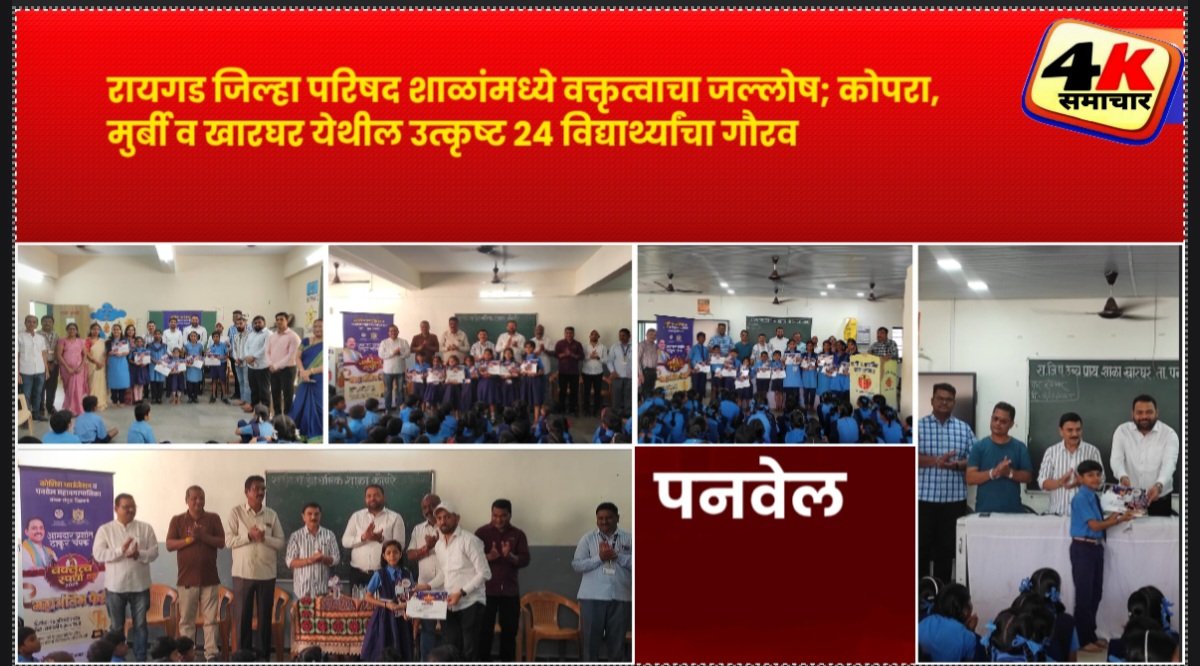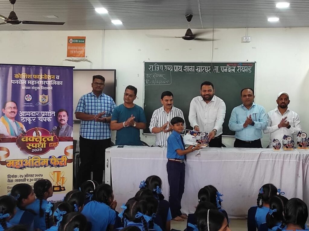 पनवेल (प्रतिनिधी) कोशिश फाऊंडेशन व पनवेल महानगरपालिका यांच्या संयुक्त विद्यमाने आयोजित “आमदार प्रशांत ठाकूर चषक वक्तृत्व स्पर्धा २०२५” अंतर्गत रायगड जिल्हा परिषद शाळांच्या आंतरशालेय पारितोषिक वितरण सोहळ्याचे उत्साहपूर्ण आयोजन करण्यात आले. या स्पर्धेत रायगड जिल्हा परिषद प्राथमिक शाळा कोपरा, मुर्बी आणि खारघर येथील विद्यार्थ्यांनी मोठ्या जोमाने सहभाग घेतला. विविध फेऱ्यांमध्ये प्रभावी कामगिरी सादर करत एकूण २४ विद्यार्थ्यांनी विजेतेपद पटकावले, तसेच या प्रतिभावान विद्यार्थ्यांचा विशेष सत्कार करण्यात आला.