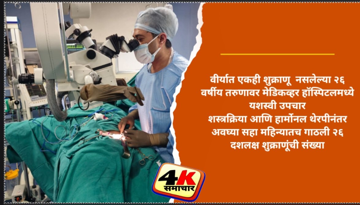 नवी मुंबई – नवी मुंबईत पहिल्यांदाच मेडिकव्हर हॉस्पिटलमध्ये युरोलॉजिस्ट आणि अँड्रोलॉजिस्ट डॉ. सनीश श्रृंगारपुरे यांच्या नेतृत्वाखालील पथकाने नॉन-ऑब्स्ट्रक्टिव्ह अॅझोस्पर्मियाने ग्रस्त असलेल्या २६ वर्षीय पुरूषावर यशस्वी शस्त्रक्रिया केली.नॉन-ऑब्स्ट्रक्टिव्ह अॅझोस्पर्मिया (NOA) हा पुरुष वंध्यत्वाच्या सर्वात गंभीर आणि आव्हानात्मक प्रकारांपैकी एक आहे, ज्यात पुरुषाच्या वीर्यात एकही शुक्राणू आढळत नाही. वृषणांना झालेली इजा, बालपणातील वृषणाचा संसर्ग, टॉर्शन टेस्टिस, रसायने आणि रेडिएशनच्या संपर्कात येणे, व्हॅरिकोसेल, हार्मोनल असंतुलन किंवा विकासात्मक समस्या यास कारणीभूत ठरु शकतात. यामध्ये नैसर्गिक शुक्राणू उत्पादन पुनर्प्राप्त करणे अत्यंत दुर्मिळ असून उपचारानंतरही केवळ ३० ते ४०% इतकी शक्यता असते.