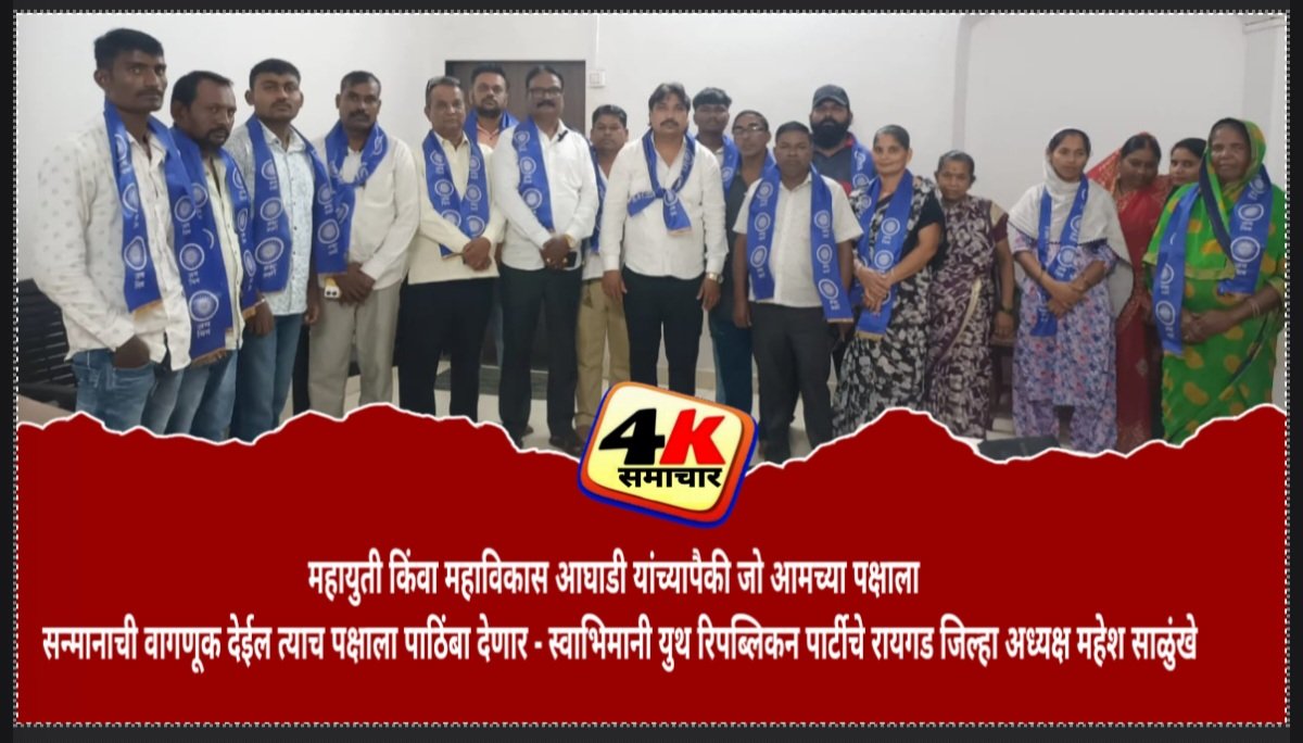 पनवेल, दि . २२ ( वार्ताहर ) : स्वाभिमानी युथ रिपब्लिकन पार्टीचे रायगड जिल्हा अध्यक्ष महेश साळुंखे यांच्या अध्यक्षतेखाली पक्षाच्या प्रमुख कार्यकर्त्यांची बैठक महेश साळुंखे यांच्या निवासस्थानी संपन्न झाली. या बैठकीमध्ये पनवेल महानगरपालिकेच्या निवडणुकीमध्ये कोणाला पाठिंबा द्यायचा याविषयी सविस्तर चर्चा करण्यात आली. त्यावेळी पक्षाच्या सर्व कार्यकर्त्यांनी महेश साळुंखे यांना पाठिंबा देण्याबाबतचे सर्व अधिकार दिलेले आहेत. पक्षाच्या कार्यकर्त्यांनी अशीही मागणी केलेली आहे की महायुती किंवा महाविकास आघाडी यांच्यापैकी जो आपल्या पक्षाला सन्मानाची वागणूक देईल त्याच पक्षाला पाठिंबा देण्यात यावा अन्यथा अपक्ष उमेदवारांना पाठिंबा देण्यात यावा.