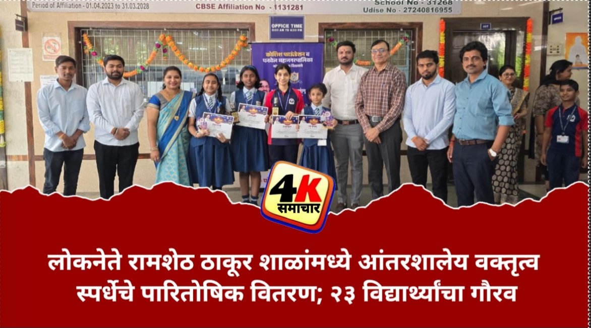 पनवेल (प्रतिनिधी) कोशिश फाऊंडेशन व पनवेल महानगरपालिका यांच्या संयुक्त विद्यमाने आयोजित “आमदार प्रशांत ठाकूर चषक वक्तृत्व स्पर्धा २०२५” अंतर्गत आंतरशालेय फेरीचे पारितोषिक वितरण सोहळा लोकनेते रामशेठ ठाकूर पब्लिक स्कूल, कामोठे तसेच लोकनेते रामशेठ ठाकूर इंग्लिश मिडियम स्कूल, कामोठे येथे उत्साहात पार पडले.या आंतरशालेय फेरीत विविध शाळांमधील विद्यार्थ्यांनी प्रभावी वक्तृत्व सादर केले होते. त्यामधून निवड झालेल्या एकूण २३ विद्यार्थ्यांना पारितोषिके व प्रमाणपत्र देऊन गौरविण्यात आले. विद्यार्थ्यांनी सामाजिक, शैक्षणिक व समकालीन विषयांवर आत्मविश्वासाने विचार मांडून उपस्थितांची दाद मिळवली.