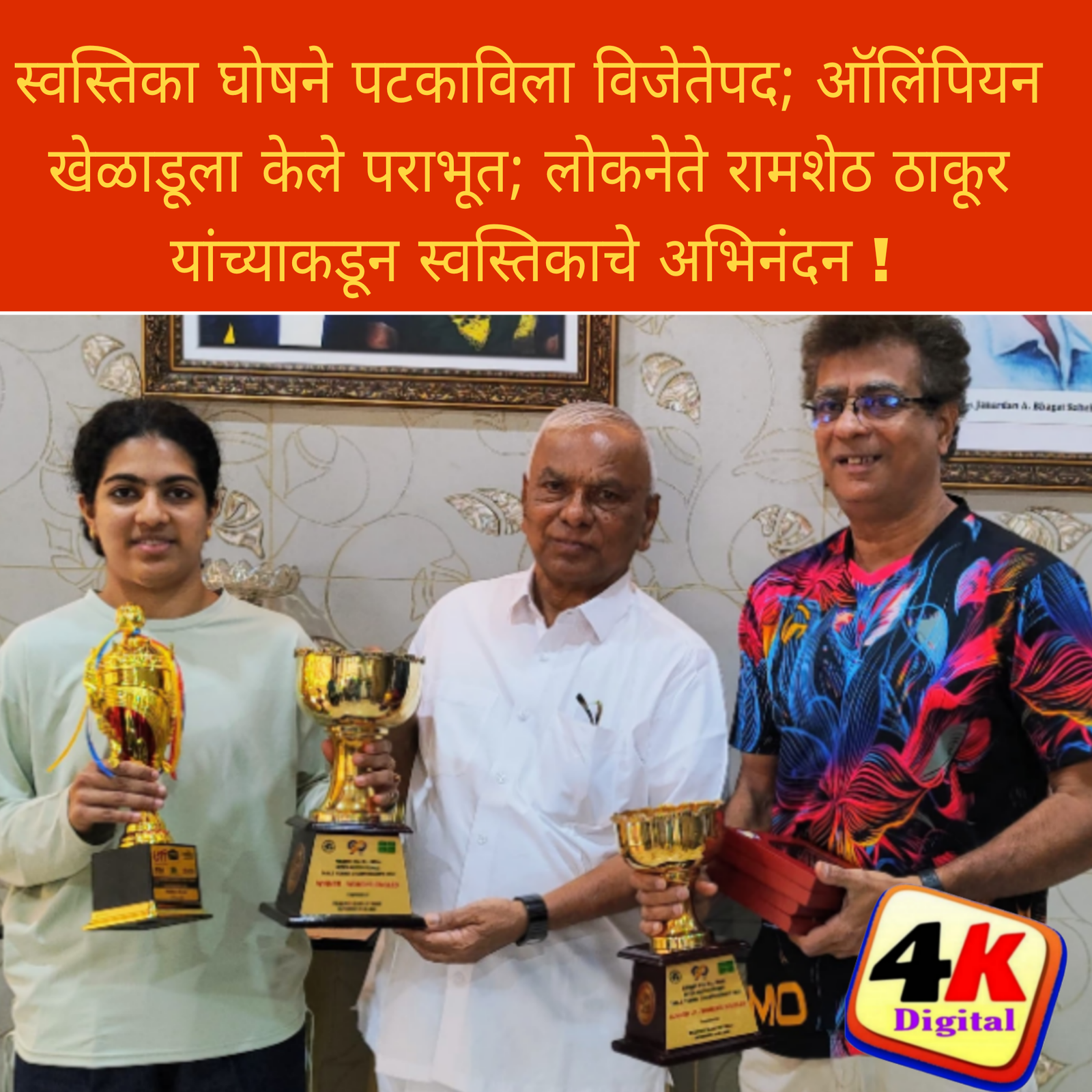 पनवेल (प्रतिनिधी)4kNews अखिल भारतीय आंतर संस्थात्मक टेबल टेनिस ५१ व्या चॅम्पियनशिप स्पर्धेत टेबल टेनिसपटू व सिकेटी महाविद्यालयाची विद्यार्थिनी स्वस्तिका संदीप घोष हिने एकेरी महिला गटात विजेतेपद पटकावले. विशेष म्हणजे तिने ऑलिम्पिक खेळाडू श्रीजा अकुला हिचा पराभव करत दैदिप्यमान कामगिरी केली. या यशाबद्दल माजी खासदार लोकनेते रामशेठ ठाकूर यांनी स्वस्तिका घोष हिचे अभिनंदन केले.