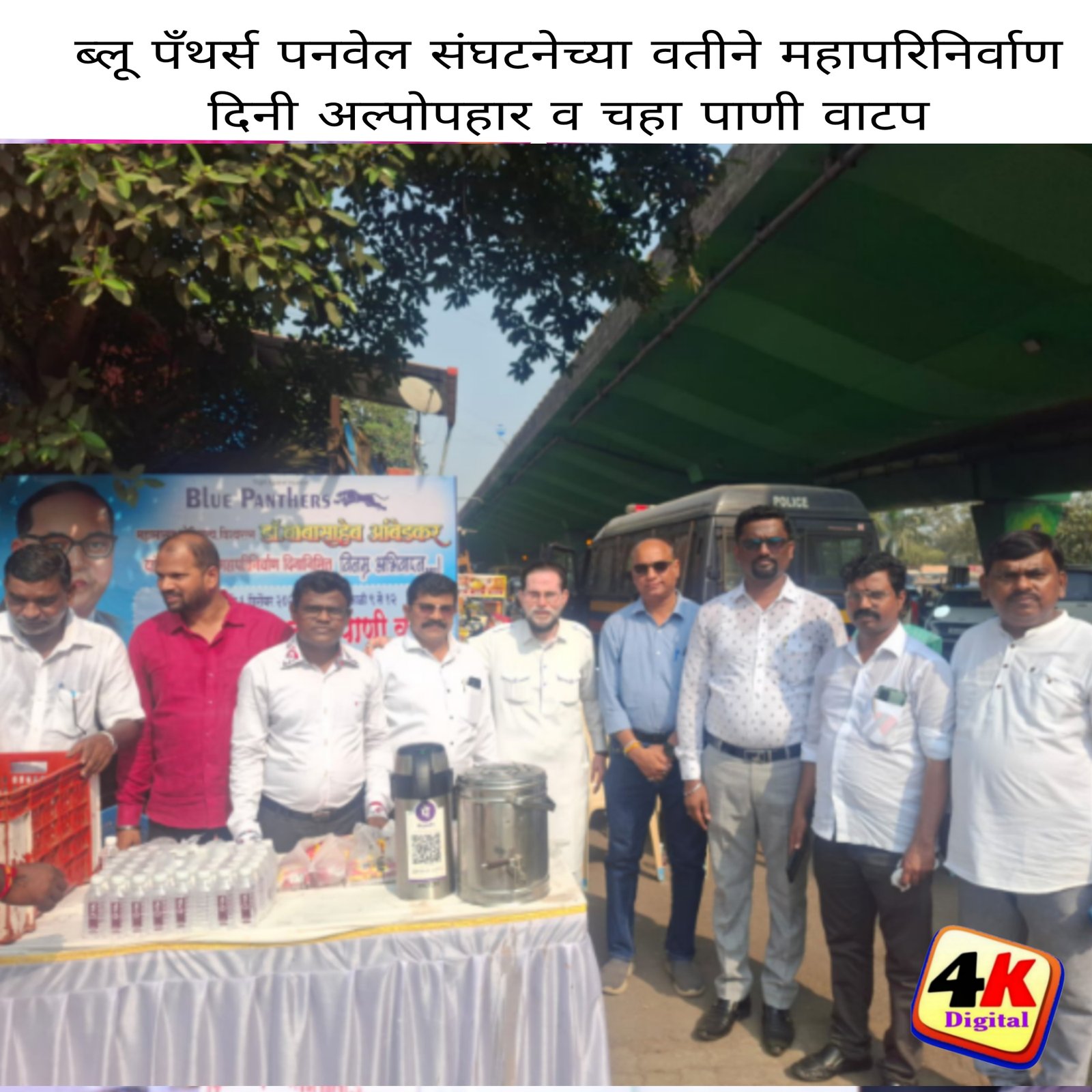 पनवेल मध्ये डॉ. बाबासाहेब आंबेडकरांच्या पुतळ्याजवळ ब्लू पॅंथर्स या संघटनेच्या वतीने बाबासाहेबांना अभिवादन करण्यासाठी येणाऱ्या भीमसैनिकांना अल्पोपहार,चहा, बिस्किटे व पाणी यांचे वाटप करण्याच्या कार्यक्रमाचे आयोजन केले होते अनेकांनी याचा लाभ घेतला,