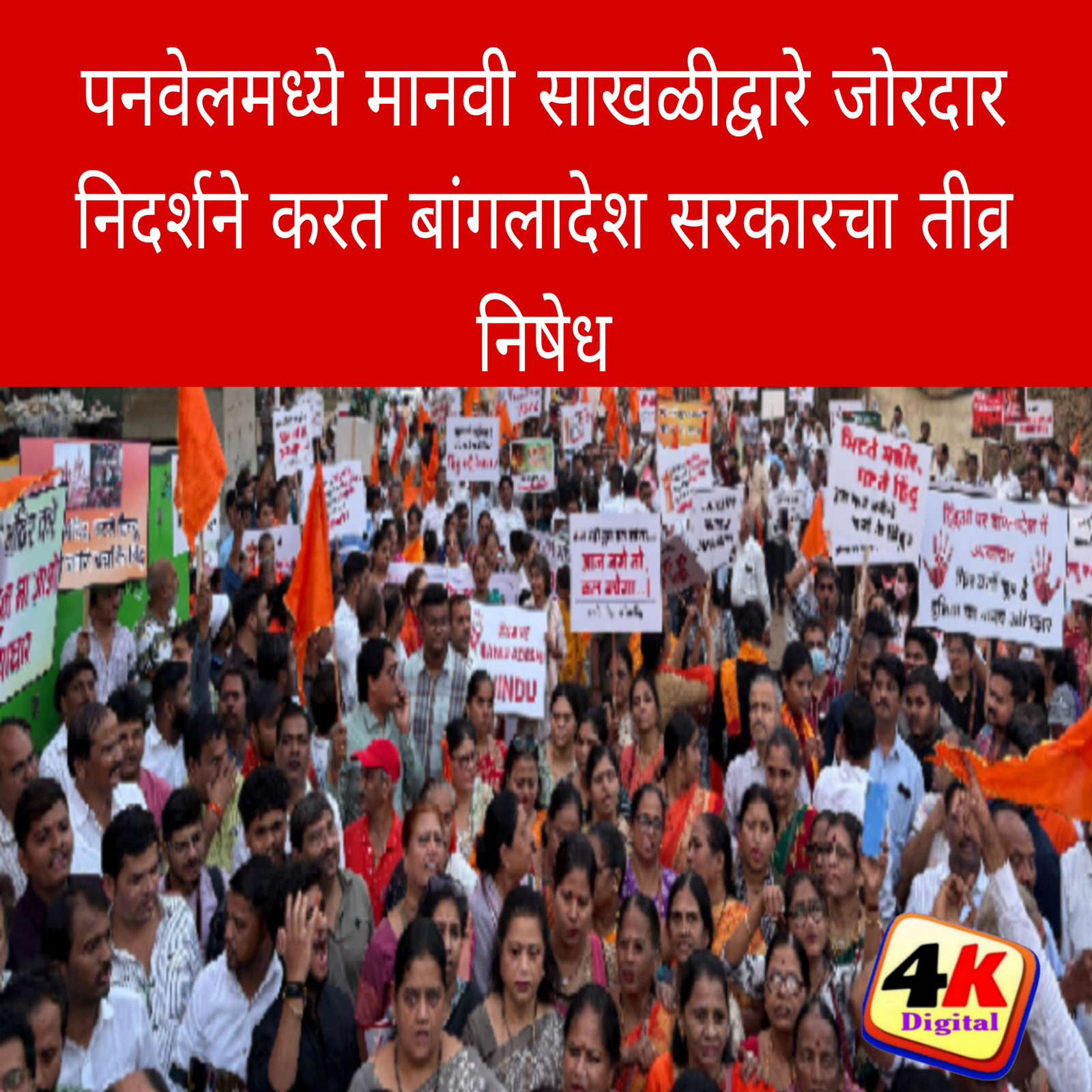 पनवेल(प्रतिनिधी) बांग्लादेशात हिंदूंवरील अत्याचाराविरोधात सकल हिंदू समाज रायगडच्यावतीने आज (दि. १०) जागतिक मानवाधिकार दिनी पनवेलमध्ये मानवी साखळीद्वारे जोरदार निदर्शने करत बांगलादेश सरकारचा तीव्र निषेध करण्यात आला. बांगलादेशातील हिंदू समाजावर होत असलेला अत्याचार तातडीने थांबिवण्याची मागणी यावेळी करण्यात आली. पनवेल रेल्वे स्थानक ते पनवेल बस डेपो अशा मार्गाने हजारोंच्या संख्येने मानवी साखळी करत हे आंदोलन करण्यात आले.