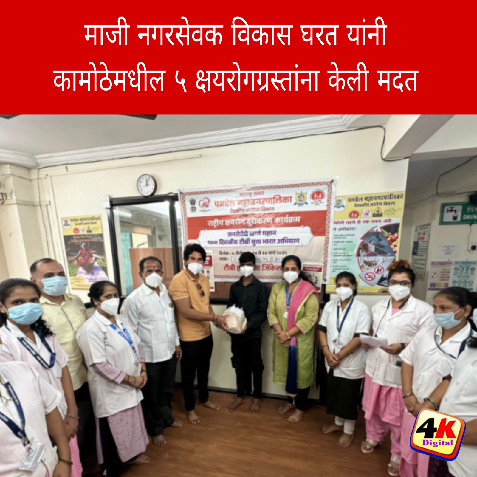 पनवेल दि.१४ 4News) : रायगड जिल्हा क्षयरोग विभागा मार्फत आणि जिल्हाधिकारी किशन जावळे यांच्या मार्गदर्शनाखाली १०० दिवसीय टीबी मुक्त अभियान संपुर्ण रायगड जिल्ह्यात राबवण्यात येत आहे. या अभियानात सामाजिक दायित्वच्या भावनेतून माजी नगरसेवक विकास घरत यांनी क्षयरोग निदान झालेल्या कामोठेमधील ५ व्यक्तींना पोषणासाठी सहाय्य दिले.