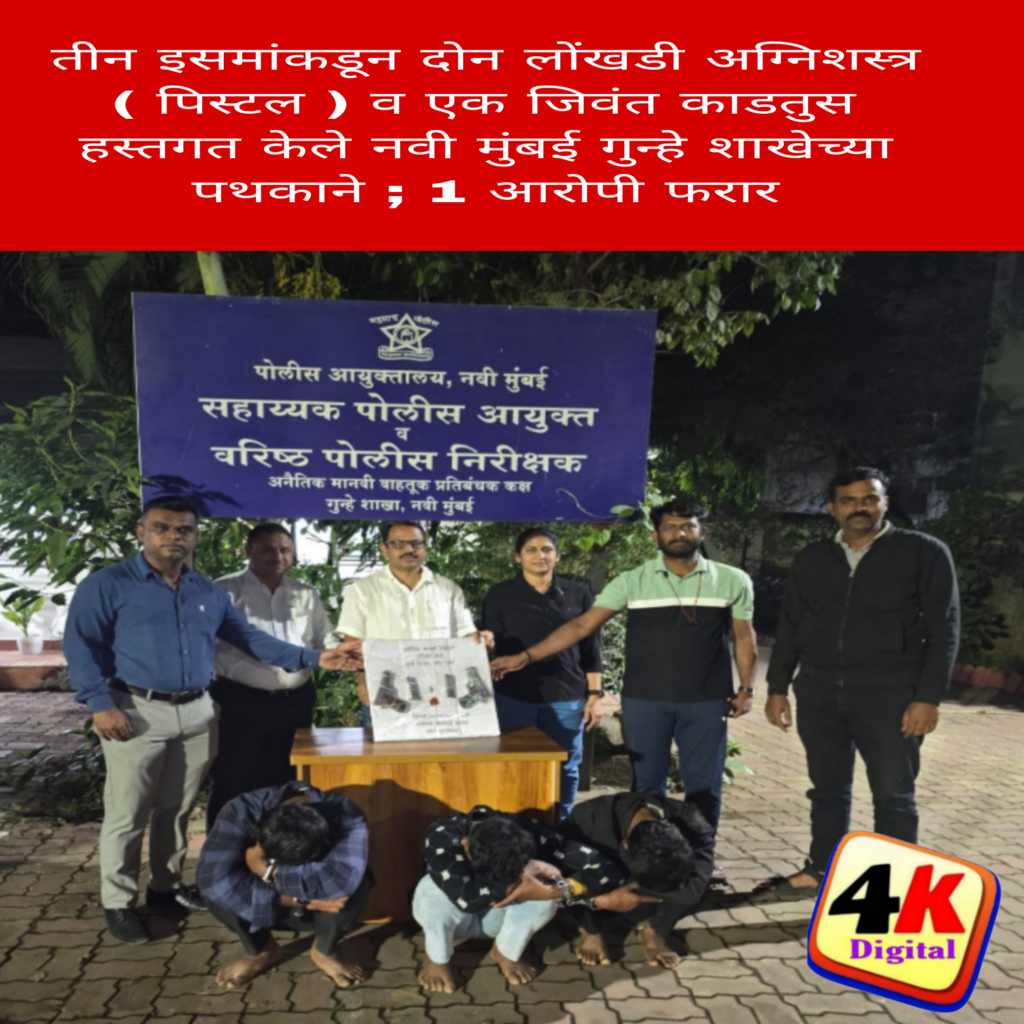 पनवेल, दि.16 (4kNews) ः पनवेल तालुक्यातील नेरे परिसरातून नवी मुंबई गुन्हे शाखेच्या पथकाने सापळा रचून तीन इसमांकडून दोन लोखंडी अग्नीशस्त्र (पिस्टल) व एक जीवंत काडतुस हस्तगत केले असून त्यांचा चौथा साथीदार पसार झाला आहे.