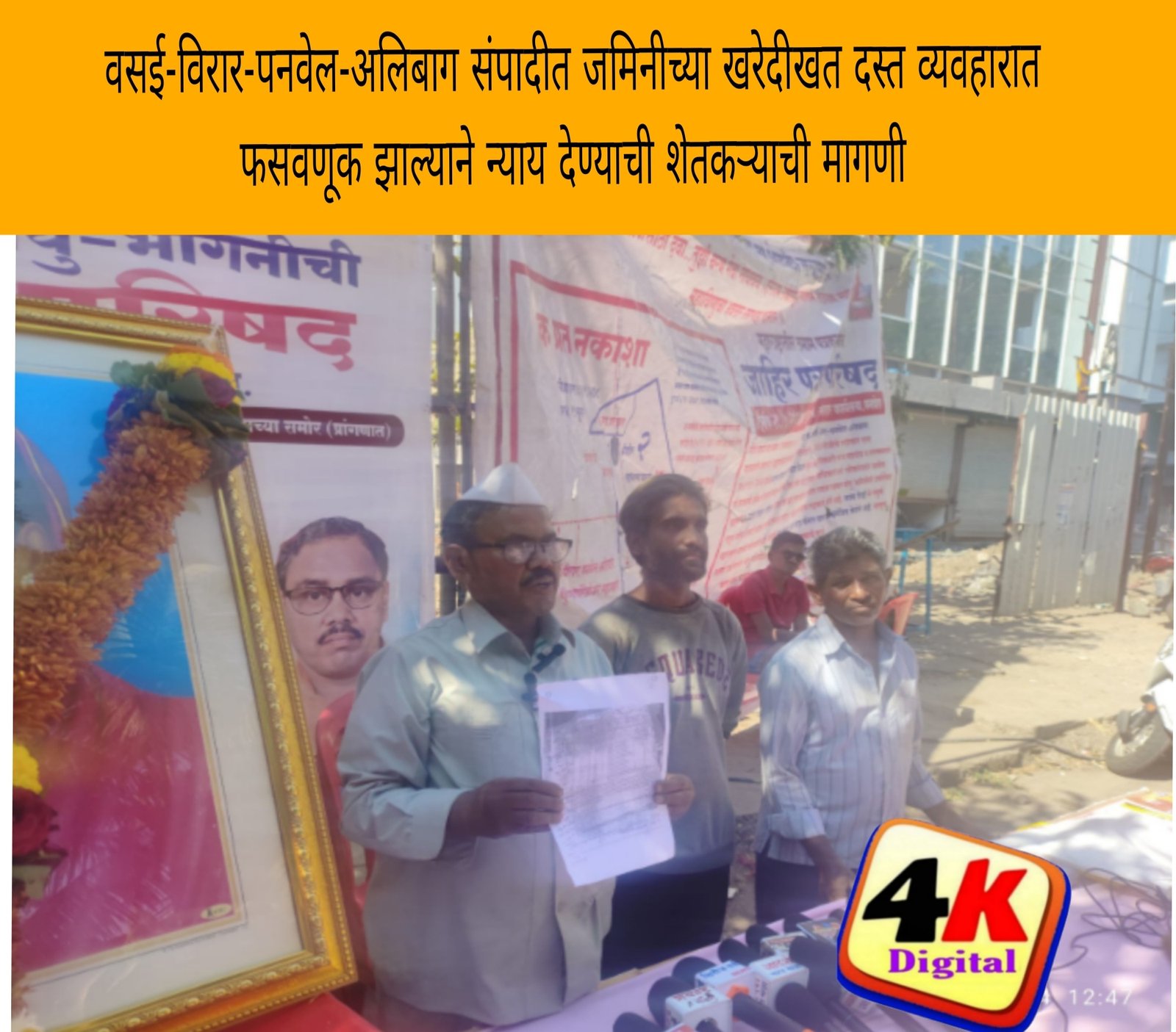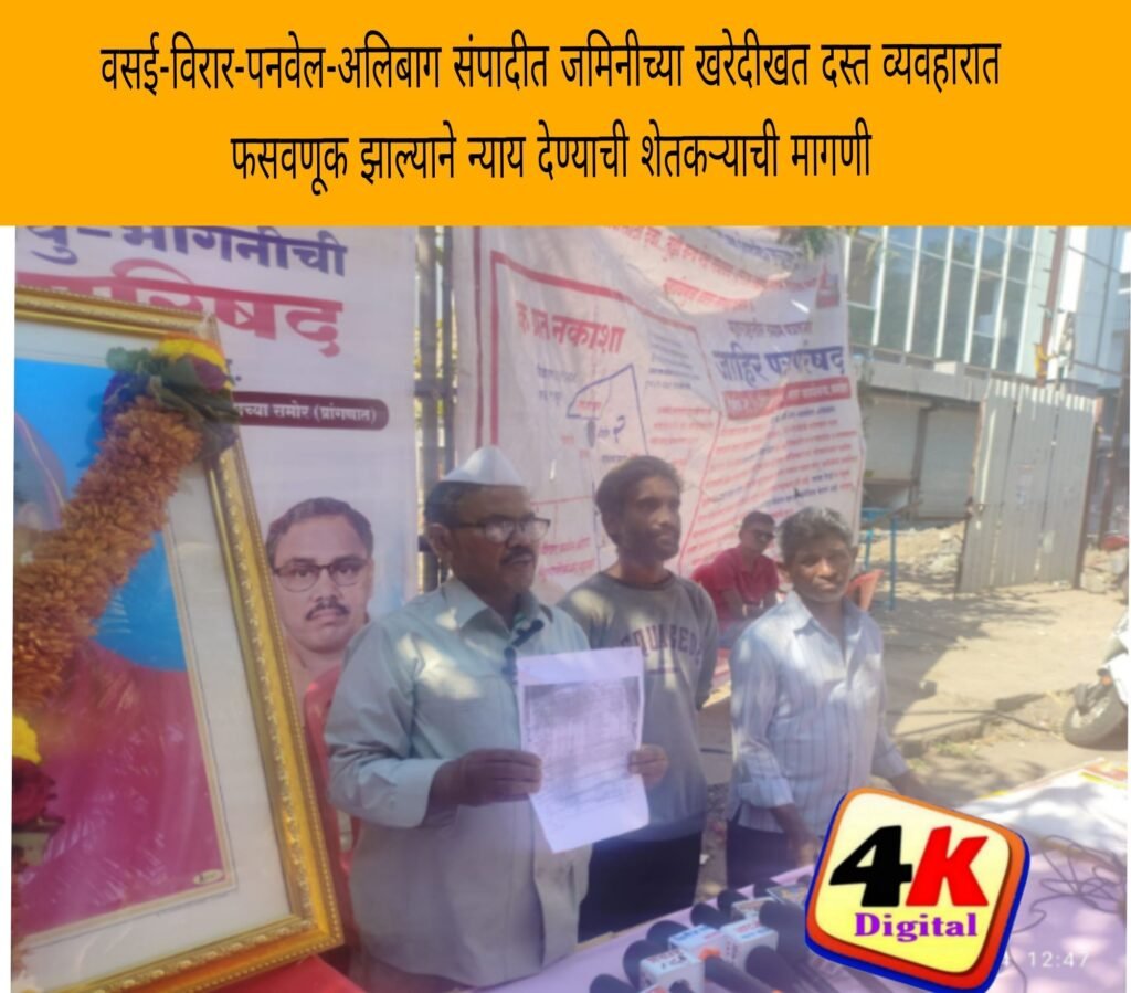 (4kNews कोमोठे ) ः पनवेल तालुक्यातील मौजे वावंजे, ता.पनवेल स.नं.123/2 या या कॉरिडोअर महामार्ग वसई-विरार-पनवेल-अलिबाग संपादीत जमिनीच्या खरेदीखत दस्त व्यवहारात फसवणूक झाल्याने न्याय देण्याची आज मागणी पनवेल शहरातील उपविभागीय अधिकारी तथा दंडाधिकारी कार्यालयासमोरील प्रांगणात घेतलेल्या 11 व्या पत्रकार परिषदेमध्ये फसवणूक झालेले शेतकरी नामदेव शंकर गोंधळी यांनी केली आहे.