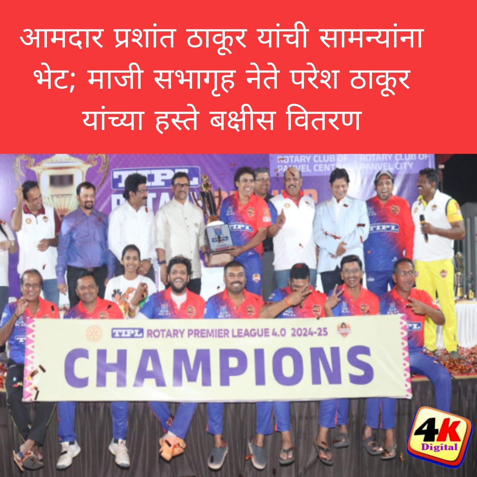 पनवेल (प्रतिनिधी) रोटरी प्रांत ३१३१ मधील क्रिकेटप्रेमी सदस्यांसाठी आयोजित करण्यात आलेल्या टीआयपीएल रोटरी प्रीमियर लीग या स्पर्धेत बीकेसी संघाने प्लॅटिनम करंडक पटकाविला तरी बाश्री संघ उपविजेता ठरला. या स्पर्धेचा सांगता व पारितोषिक वितरण सोहळा रविवारी कळंबोली येथील मैदानात झाला. पनवेल महापालिकेचे माजी सभागृह नेते परेश ठाकूर यांच्या हस्ते बक्षीस वितरण झाले. दरम्यान, स्पर्धेला आमदार प्रशांत ठाकूर यांनी भेट देऊन खेळाडूंचा उत्साह वाढवला व आयोजकांचे कौतुक केले.