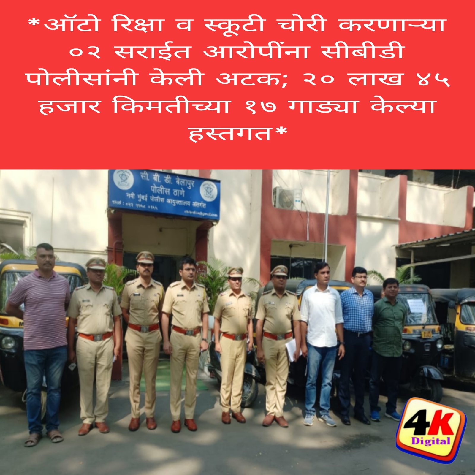 पनवेल दि.२३(संजय कदम): पनवेलसह खारघर, कळंबोली, सीबीडी, उलवा, वाशी, नेहरूनगर, बांद्रा , पंत नगर, खार आदी ठिकाणावरून १७ ऑटो रिक्षा व स्कूटी चोरी करणाऱ्या ०२ सराईत आरोपींना सीबीडी पोलीसांनी अटक करून त्यांच्या कडून जवळपास २० लाख ४५ हजार किमतीच्या गाड्या हस्तगत केल्या आहेत.