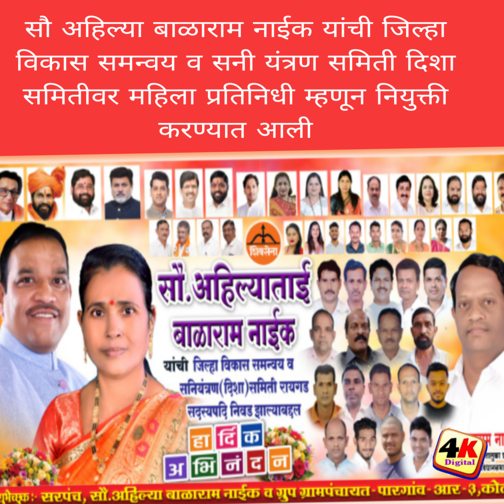 शिवसेना मावळचे लोकप्रिय खासदार उत्तम ससंद पटू श्रीरंग आप्पा बारणे साहेब खासदार यांच्या आशीर्वादाने सौ अहिल्या बाळाराम नाईक सरपंच यांचे केंद्र पुरस्कार योजना अंतर्गत कामांचा आढावा घेण्यासाठी जिल्हा विकास समन्वय व सनी यंत्रण समिती दिशा समितीवर महिला प्रतिनिधी म्हणून नियुक्ती करण्यात आली आहे