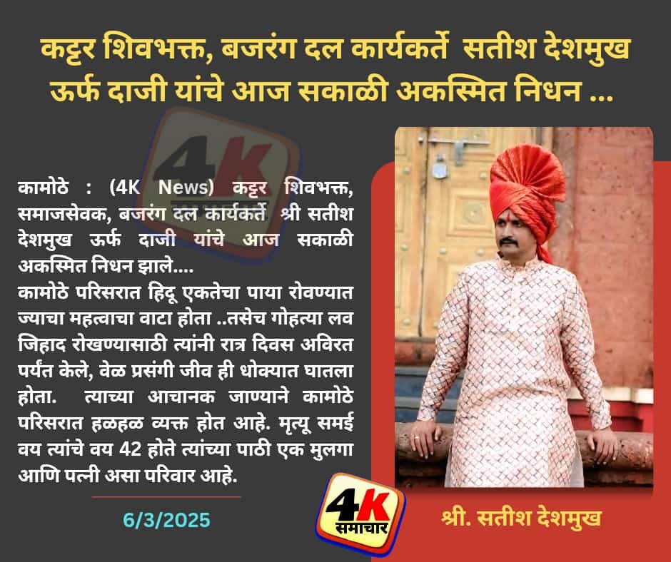 कामोठे : (4K News) कट्टर शिवभक्त, समाजसेवक, बजरंग दल कार्यकर्ते श्री सतीश देशमुख ऊर्फ दाजी यांचे आज सकाळी अकस्मित निधन झाले….