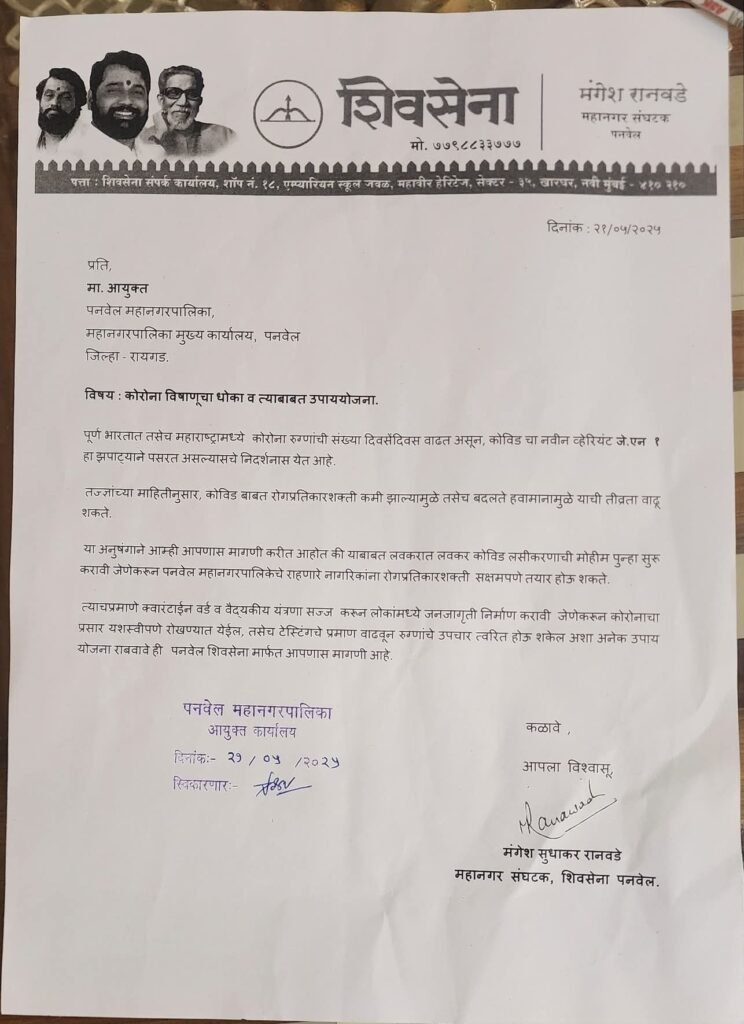 त्यामध्ये लसीकरण क्वारंटाईन वार्ड उभा करणे, कोरोना टेस्टिंग ची यंत्रणा उभी करणे अशा विविध मागण्या नमूद केलेले निवेदन पनवेल महानगरपालिकेला सादर केले. आयुक्त मंगेश चितळे यांनी याबाबत शिष्टमंडळात माहिती देताना नमूद केले की सर्व प्राथमिक आरोग्य केंद्र तसेच आपला दवाखाना मध्ये, कोरोना संबंधित अतिदक्षता व लक्षण असल्यास त्वरित ट्रीटमेंट संबंधी आदेश जारी केलेले आहेत व त्याचप्रमाणे खाजगी रुग्णालयांमध्ये सुद्धा याबाबतची सतर्कता सर्व डॉक्टरांना देण्यात येणार आहे.
