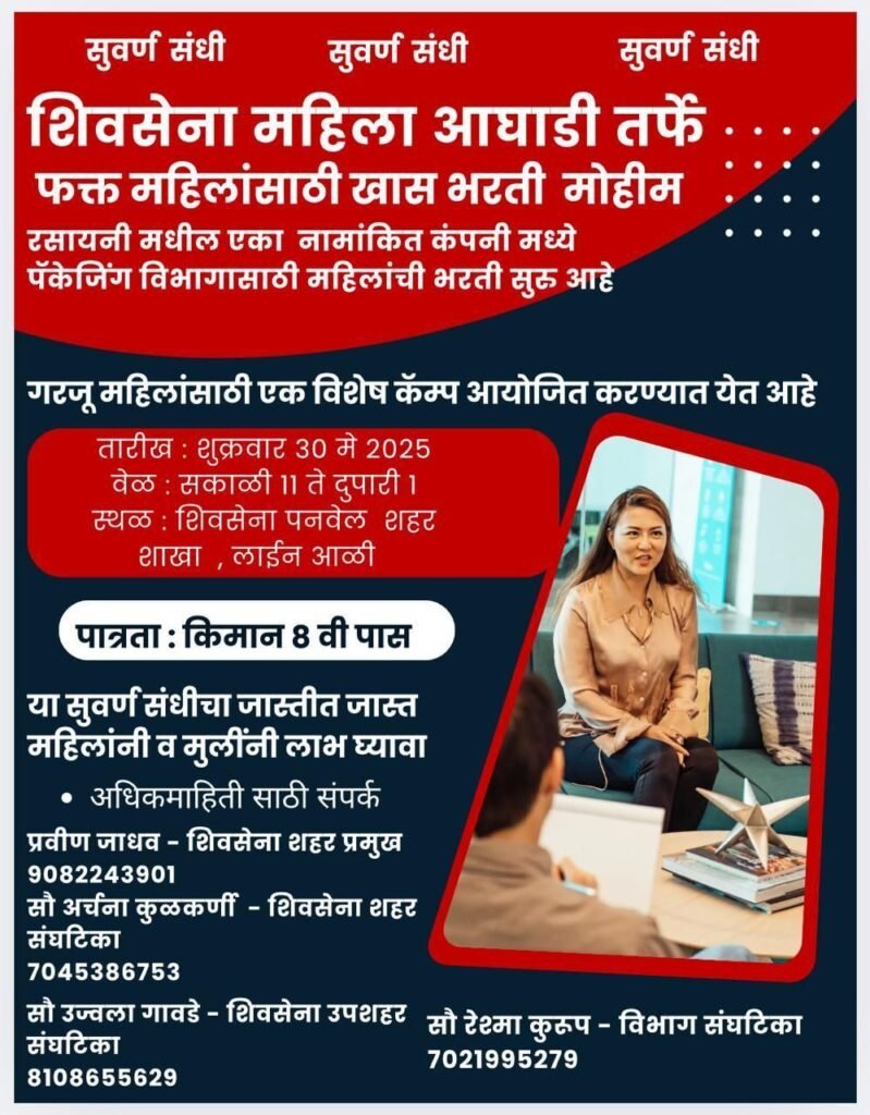 यासाठी गरजू महिलांसाठी एक विशेष कॅम्पचे आयोजन शुकवार दि.30 मे 2025 रोजी सकाळी 11 ते दुपारी 1 वाजेपर्यंत शिवसेना पनवेल शहर शाखा लाईन आळी येथे करण्यात आले असून यासाठी किमान पात्रता आठवी पास आवश्यक आहे.