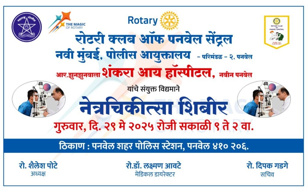 गुरुवार दि.29 मे 2025 रोजी सकाळी 9 ते दुपारी 2 वाजता पनवेल शहर पोलीस ठाणे येथे सदर शिबिराचे आयोजन करण्यात आले असून या शिबिराचा लाभ परिमंडळ 2 हद्दीतील सर्वच अधिकारी व कर्मचारी व त्यांच्या कुटुंबियांनी घ्यावा, असे आवाहन रोटरीचे अध्यक्ष रो.शैलेश पोटे, मेडीकल डायरेक्टर रो.डॉ.लक्ष्मण आवटे व सचिव रो.दिपक गडगे यांनी केले आहे.
