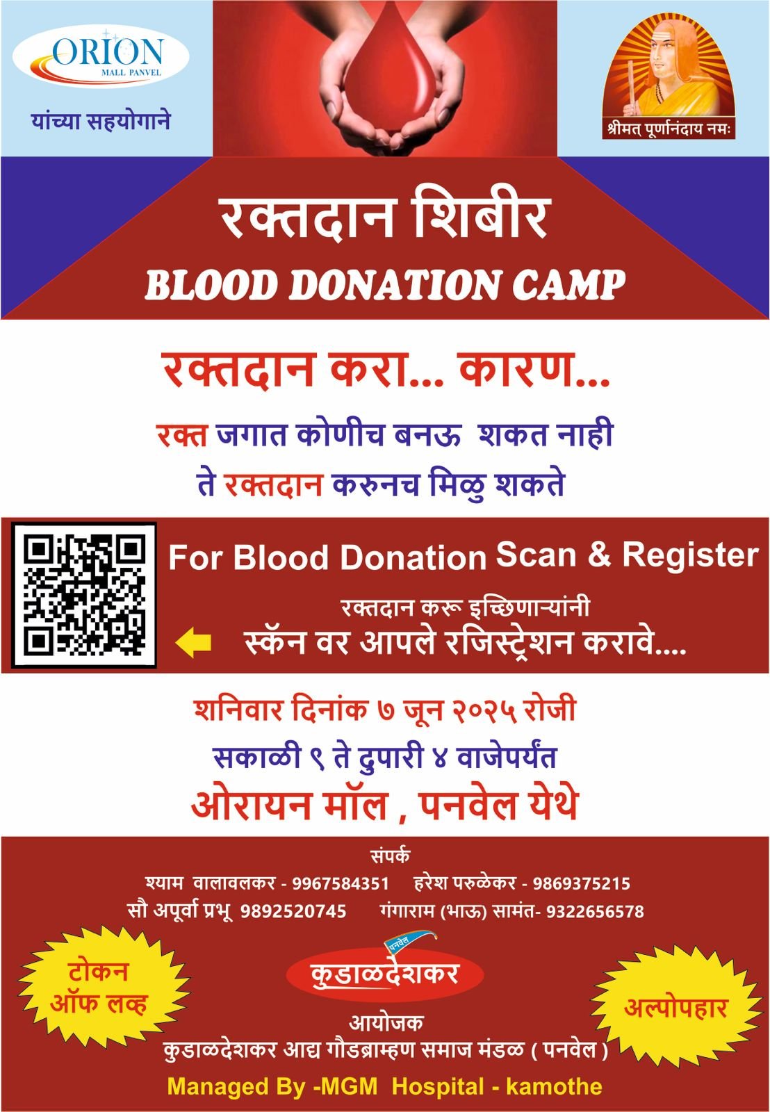 या रक्तदान शिबिरासाठी एम जी एम कामोठे यांचे विशेष सहकार्य लाभणार आहे. तरी जास्तीत जास्त लोकांनी रक्तदान करावे यासाठी संपर्क श्याम वालावलकर(९९६७५८४३५१), हरेश परुळेकर(९८६९३७५२१५), सौ अपूर्वा प्रभू (९८९२५२०७४५) व गंगाराम (भाऊ) सामंत (९३२२६५६५७८) यांच्याशी संपर्क साधावा. सदर शिबीर ओरायन मॉल यांच्या सौजन्याने आयोजित करण्यात आले आहे.