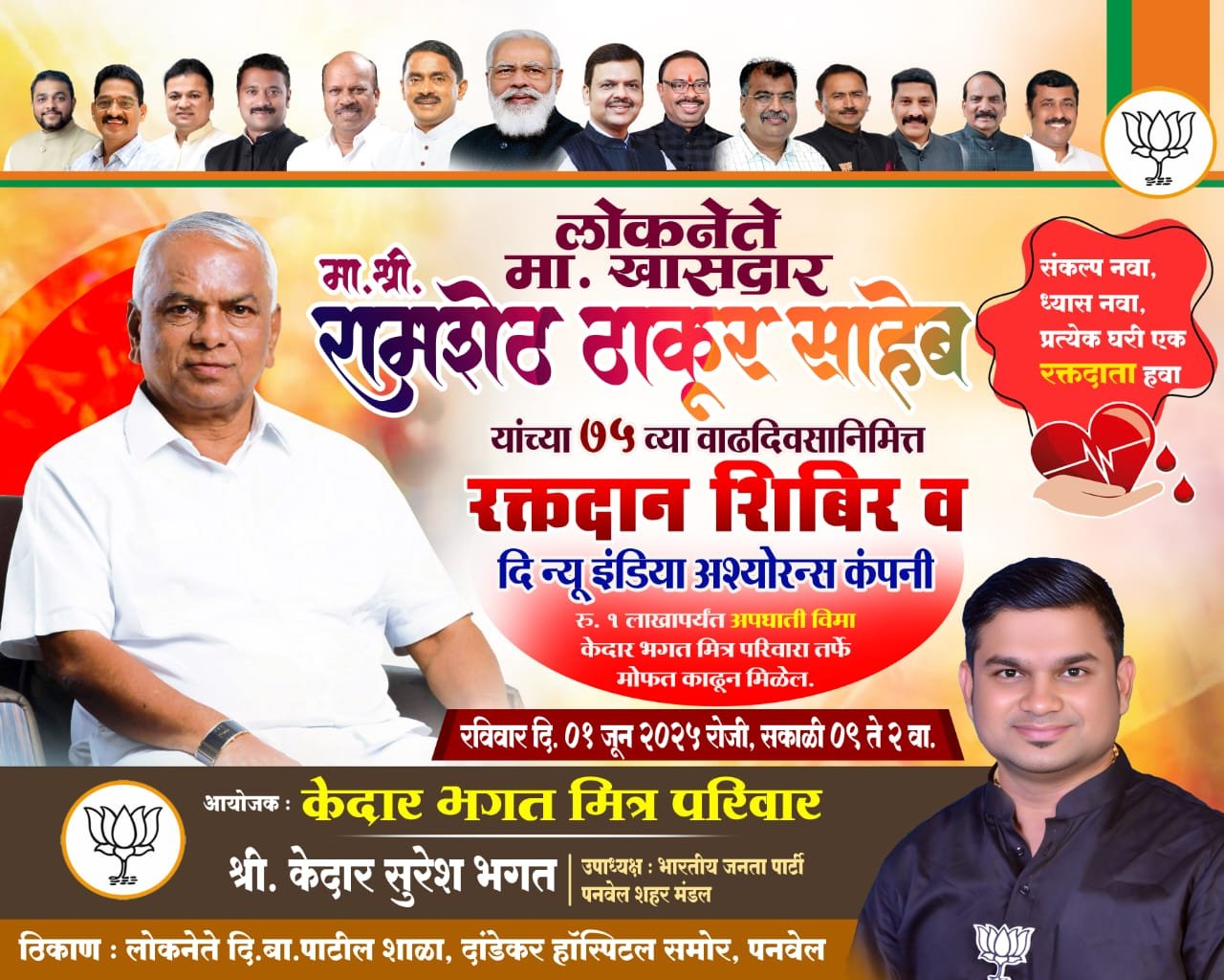 *पनवेल/प्रतिनिधी:* लोकनेते मा.खा.रामशेठ ठाकूर यांच्या वाढदिवसानिमित्त केदार भगत मित्र परिवाराकडून रक्तदान शिबिराचे आयोजन करण्यात आले आहे.रविवार दिनांक 1 जून रोजी लोकनेते दि.बा.पाटील विद्यालयात सकाळी 9 ते 2 वाजेपर्यंत हे शिबीर आयोजित करण्यात आले आहे.