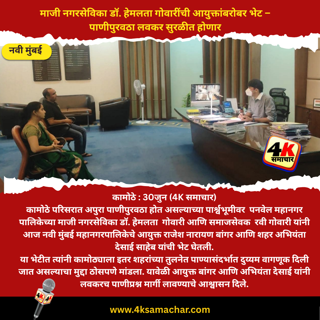 कामोठे परिसरात अपुरा पाणीपुरवठा होत असल्याच्या पार्श्वभूमीवर नगरसेविका डॉ. हेमलता रवि गोवारी यांनी आज नवी मुंबई महानगरपालिकेचे आयुक्त राजेश नारायण बांगर आणि शहर अभियंता देसाई साहेब यांची भेट घेतली.