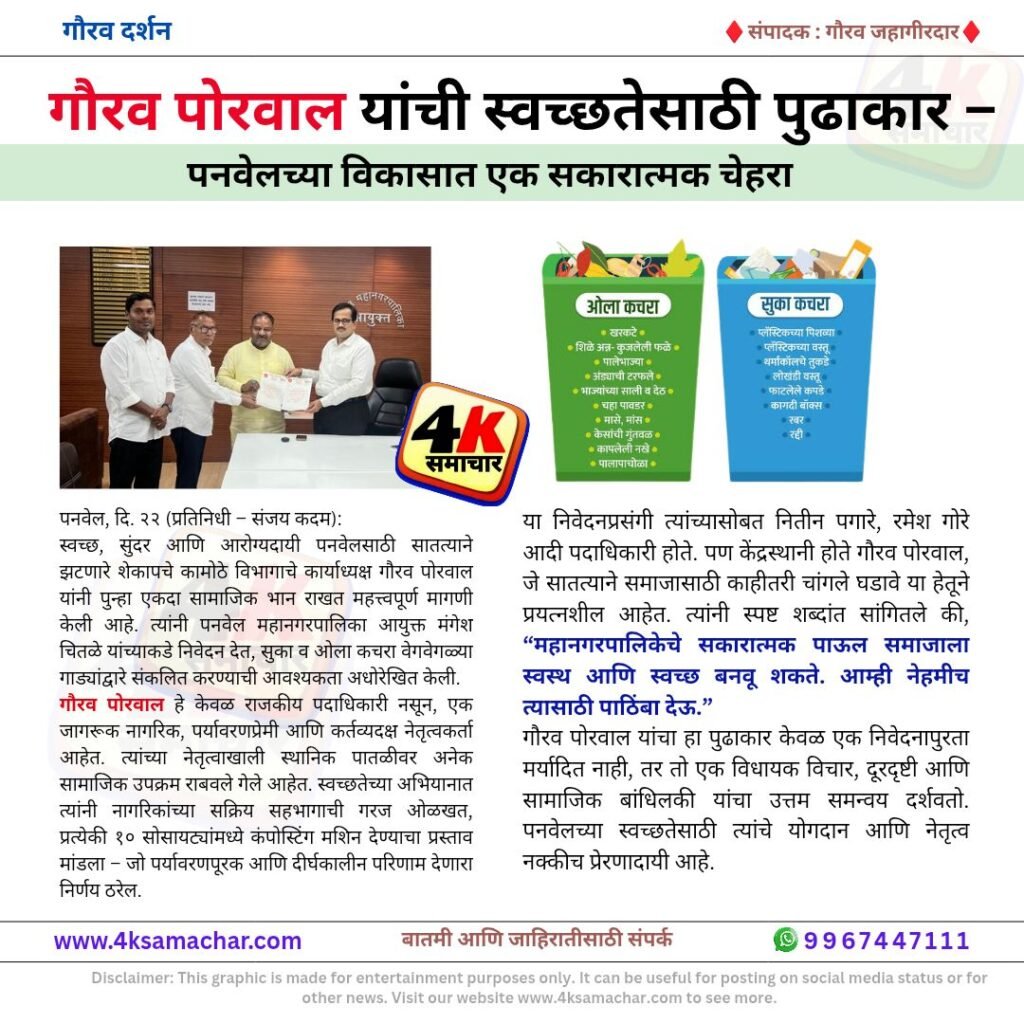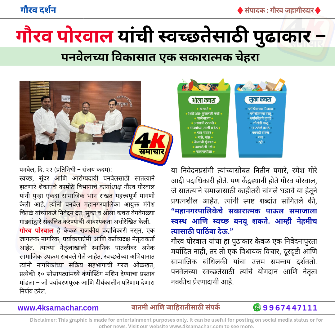 पनवेल दि. २२ 4k समाचार ( संजय कदम ) : पनवेल महानगरपालिका क्षेत्रामध्ये सुका कचरा आणि ओला कचरा गोळा करण्यासाठी वेगवेगळ्या गाड्या सुरु कराव्यात अशी मागणी पनवेल महानगरपालिकेचे आयुक्त मंगेश चितळे यांच्याकडे शेकाप कामोठे कार्याध्यक्ष गौरव पोरवाल यांनी निवेदनाद्वारे केली आहे