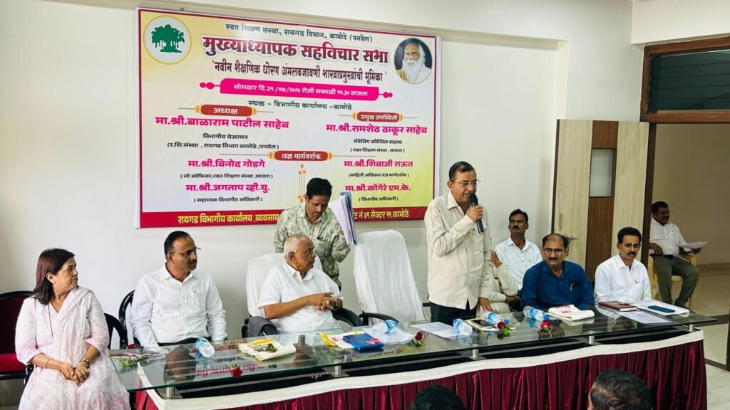 उरण दि २२(विठ्ठल ममताबादे ) नवीन शैक्षणिक धोरण अंमलबजावणी व शाखाप्रमुख भूमिका या विषयावर रायगड विभागीय कार्यशाळा रयत शिक्षण संस्थेच्या रायगड विभाग प्राचार्य व मुख्याध्यापक कार्यशाळा सोमवार दिनांक २१/७/२०२५ रोजी रायगड विभागीय चेअरमन माजी आमदार बाळाराम पाटील यांचे अध्यक्षते खाली संपन्न झाली.