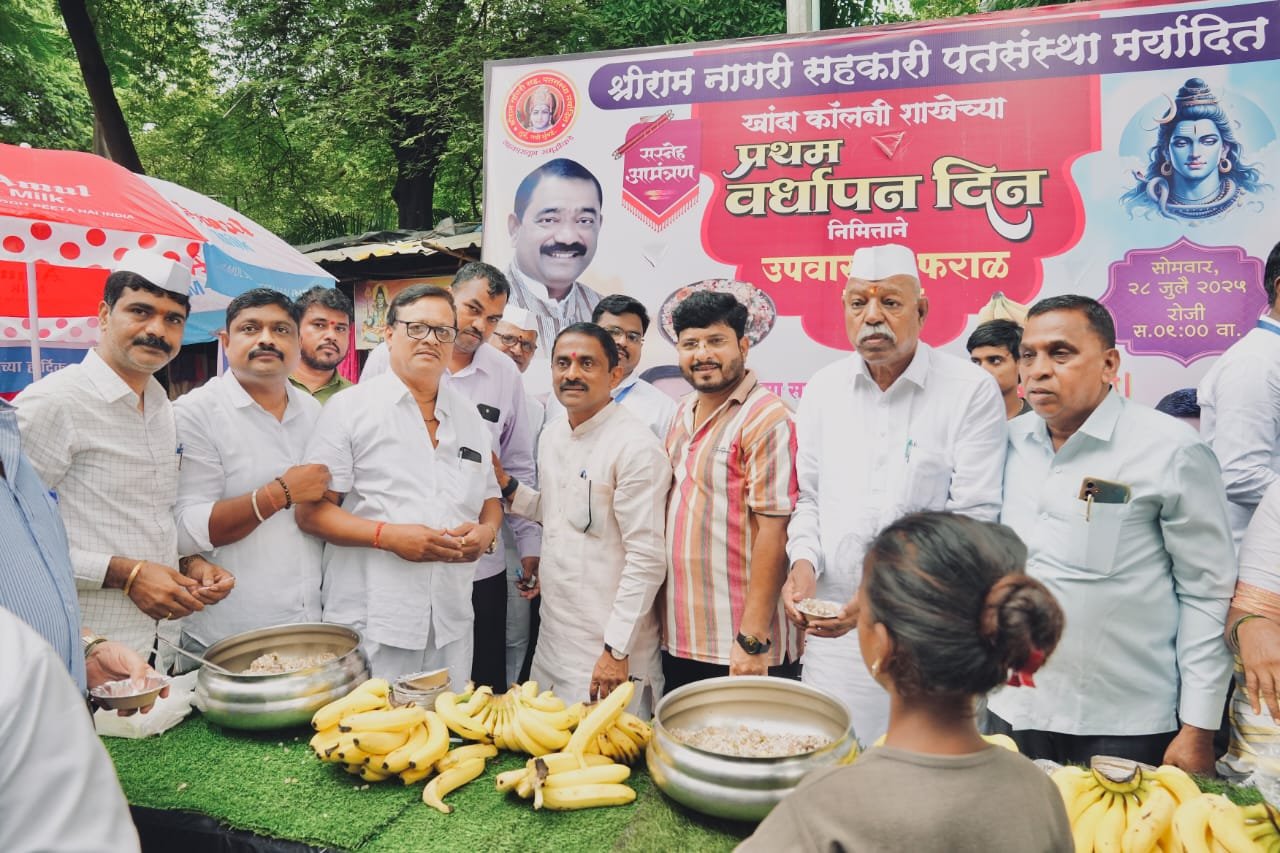 श्रावण महिन्याच्या पहिल्या सोमवारी खांदा कॉलनीतील श्रीराम नागरी सहकारी पतसंस्थेच्या पहिल्या वर्धापन दिनानिमित्त खांदेश्वर मंदिरात शिवभक्तांसाठी भव्य अल्पोपहार वाटप कार्यक्रमाचे आयोजन करण्यात आले. या उपक्रमात २०० किलो साबुदाणा खिचडी आणि ५०० डझन केळी अशा उपवासाच्या फराळाचे वितरण करण्यात आले.