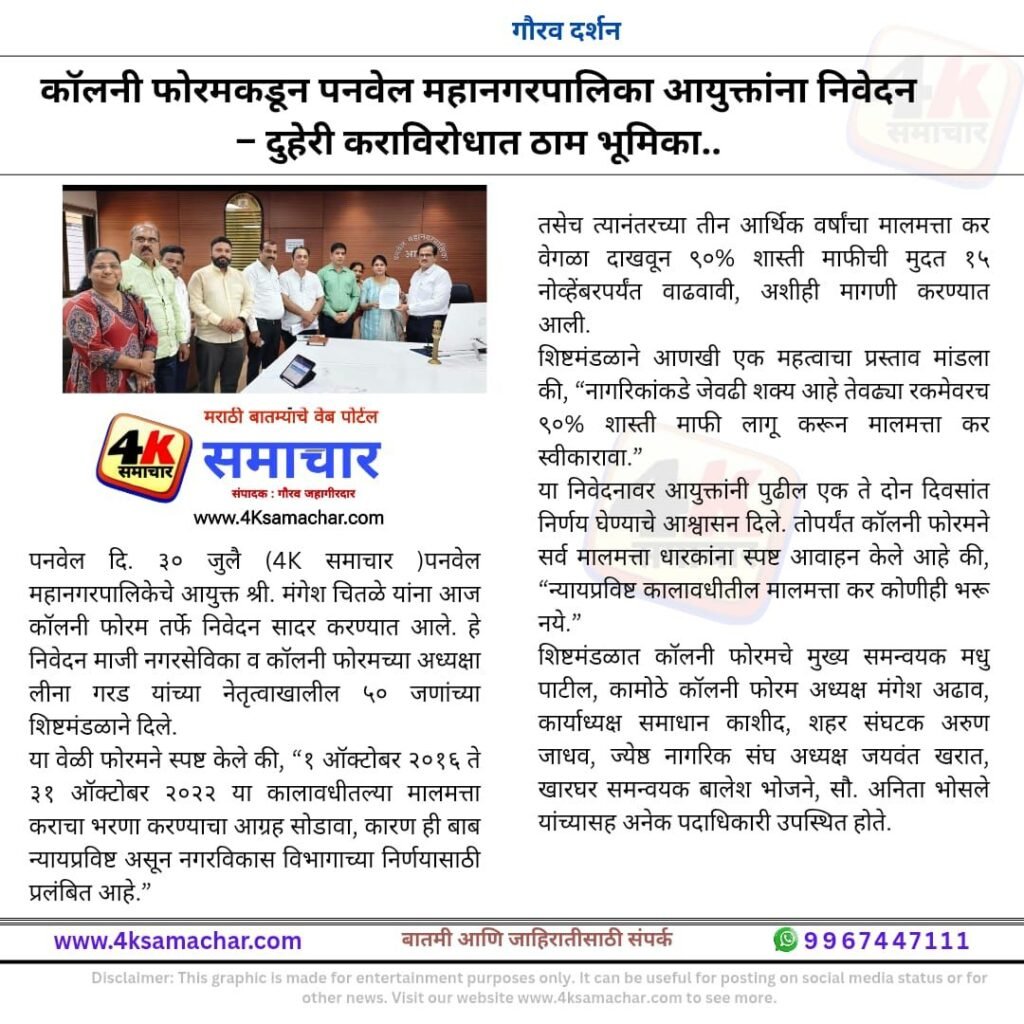 पनवेल दि. ३० जुलै (4K समाचार )पनवेल महानगरपालिकेचे आयुक्त श्री. मंगेश चितळे यांना आज कॉलनी फोरम तर्फे निवेदन सादर करण्यात आले. हे निवेदन माजी नगरसेविका व कॉलनी फोरमच्या अध्यक्षा लीना गरड यांच्या नेतृत्वाखालील ५० जणांच्या शिष्टमंडळाने दिले.