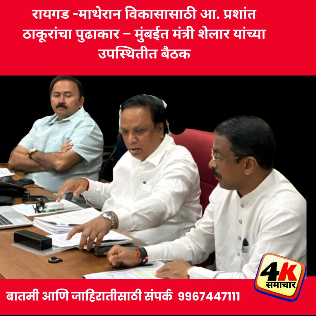 रायगड जिल्ह्यातील माथेरान परिसरातील विविध समस्या सोडवण्यासाठी आमदार प्रशांत ठाकूर यांनी मुंबईत बैठक घेतली. यामध्ये मंत्री अॅड. आशीष शेलार यांच्या अध्यक्षतेखाली विविध विषयांवर चर्चा झाली