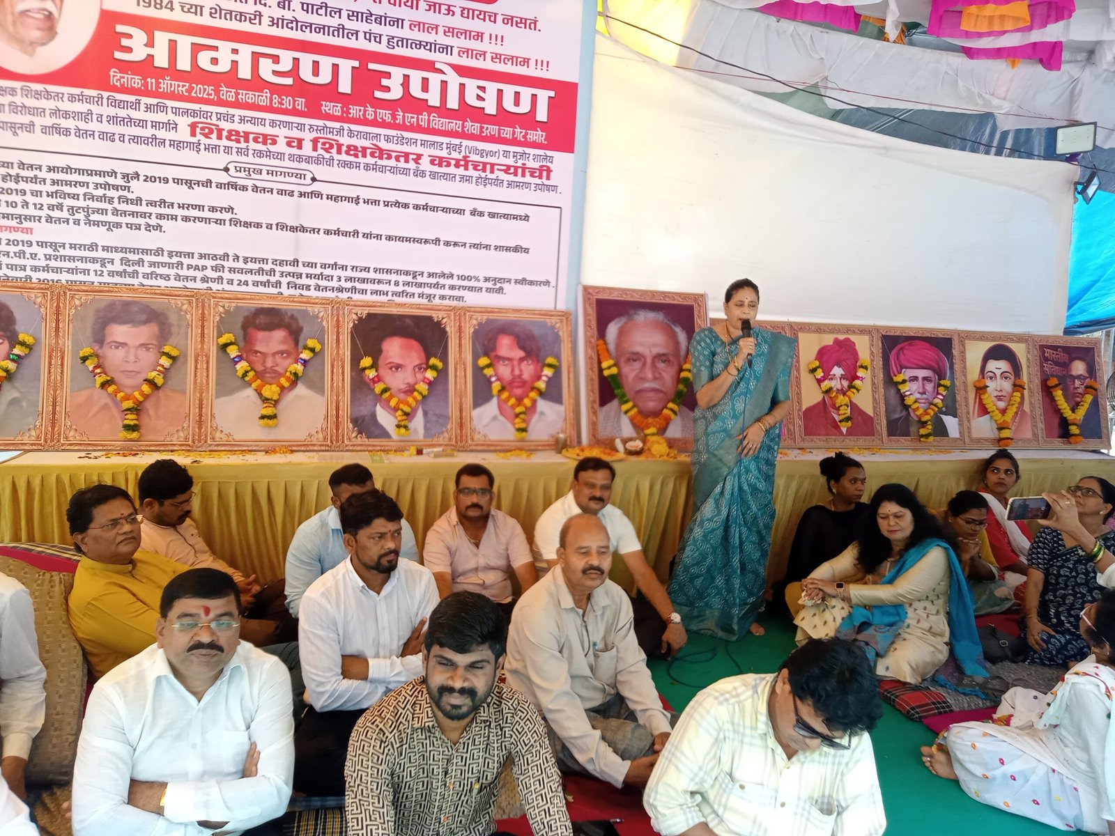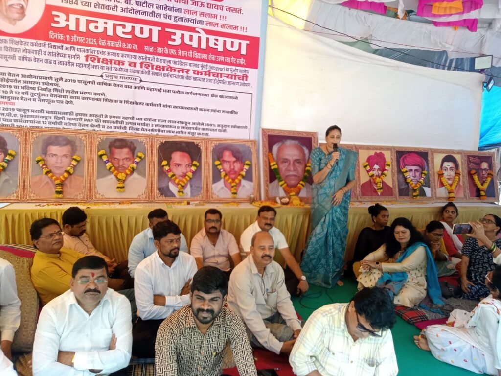 उरण दि ११(विठ्ठल ममताबादे )उरणमधील शिक्षक व शिक्षकेतर कर्मचाऱ्यांनी आपल्या विविध मागण्यांसाठी आजपासून (११ ऑगस्ट) आमरण उपोषण सुरू केले आहे. हे उपोषण सकाळी ८:३० वाजल्यापासून आर.के.एफ. जे.एन.पी. विद्यालय, शेवा, उरण येथील गेटसमोर सुरू आहे. उपोषणाच्या पहिल्याच दिवशी विविध क्षेत्रातील मान्यवरांनी आणि स्थानिक नागरिकांनी पाठिंबा दर्शवत कर्मचाऱ्यांच्या मागण्यांना पाठिंबा दिला.