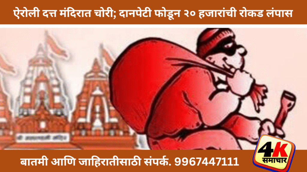 ऐरोली, दि. ११ (वार्ताहर) : ऐरोली सेक्टर १७ येथील दत्त मंदिरात मध्यरात्रीच्या सुमारास अज्ञात चोरट्याने दोन दानपेट्या फोडून अंदाजे १५ ते २० हजार रुपयांची रोकड चोरली. सकाळी मंदिर उघडताना हा प्रकार उघडकीस आला.