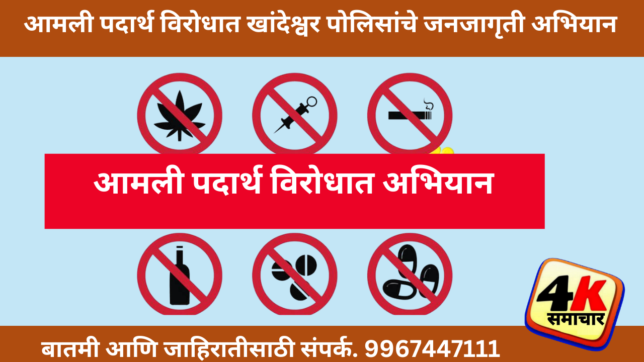 पनवेल दि. १४ ( वार्ताहर ) : आमली पदार्थ विरोधात खांदेश्वर पोलिसांचे जनजागृती अभियान करीत नागरिकांना सतर्क राहण्याचे आवाहन केले आहे . आमली पदार्थ म्हणजे ज्या पदार्थाचे सेवनाने माणसाला एक विशिष्ट प्रकारची सुस्ती, नशा, तार किंवा धुंदी येते त्यांना अंमली पदार्थ म्हणतात.त्यामध्ये गांजा, चरस, हेरॉईन, कोकेन, मॅफेड्रॉन, ब्राऊन शुगर अशा पदार्थाचा समावेश होतो.अंमली पदार्थामुळे मानवी शरीरावर होणारे परीनाम म्हणजे स्मरणशक्तीचा -हास होणे, नविन गोष्टी शिकण्याची क्षमता कमी होते, ग्रहणशक्ती कमी होते, विचारशक्ती कमी होते, असंबध्दता निर्माण होते, चिंता व भय, मुत्रपिंड खराब होते,