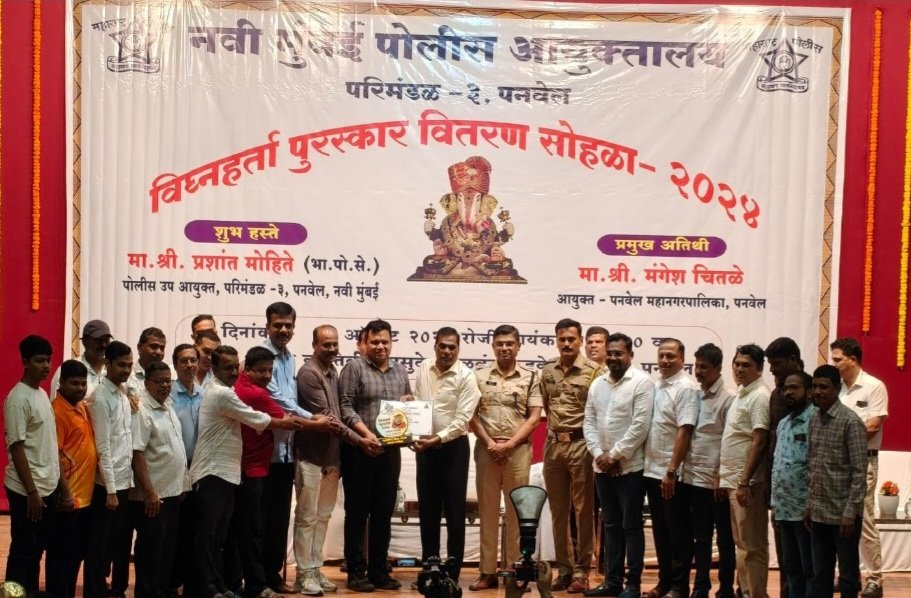 पनवेल दि.20 (वार्ताहर): नवी मुंबई पोलीस आयुक्तालयाच्या वतीने ‘सार्वजनिक गणेशोत्सव सन २०२४’ मधील उत्कृष्ट गणेश मंडळांना “विघ्नहर्ता” पुरस्कार प्रदान करण्यात आले. हा पुरस्कार वितरण समारंभ पनवेल येथील आद्य क्रांतिवीर वासुदेव बळवंत फडके नाट्यगृहात पार पडला.