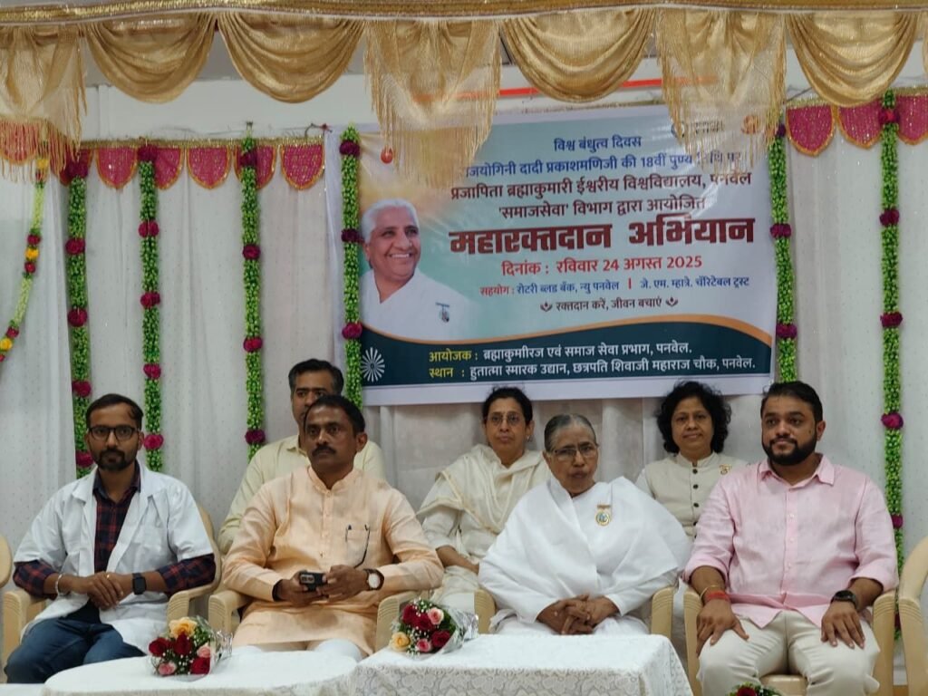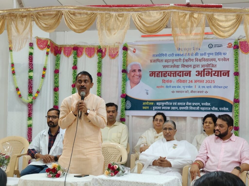 राजयोगिनी प्रकाशमणी दादीजींच्या १८ व्या पुण्यस्मरण दिनानिमित्त तसेच विश्वबंधुत्व दिनाच्या पावन प्रसंगी प्रजापिता ब्रह्माकुमारीज ईश्वरीय विश्वविद्यालय, समाजसेवा विभाग – पनवेल व रोटरी ब्लड बँक यांच्या संयुक्त विद्यमाने दिनांक २४ ऑगस्ट २०२५ रोजी हुतात्मा स्मारक उद्यान, छत्रपती शिवाजी महाराज चौक, पनवेल येथे भव्य रक्तदान शिबिरांचे आयोजन करण्यात आले.या कार्यक्रमासाठी उपस्थित मान्यवर आमदार प्रशांत ठाकूर पनवेल, सुनील झुनझारराव, अध्यक्ष-भाजपा पनवेल शहर