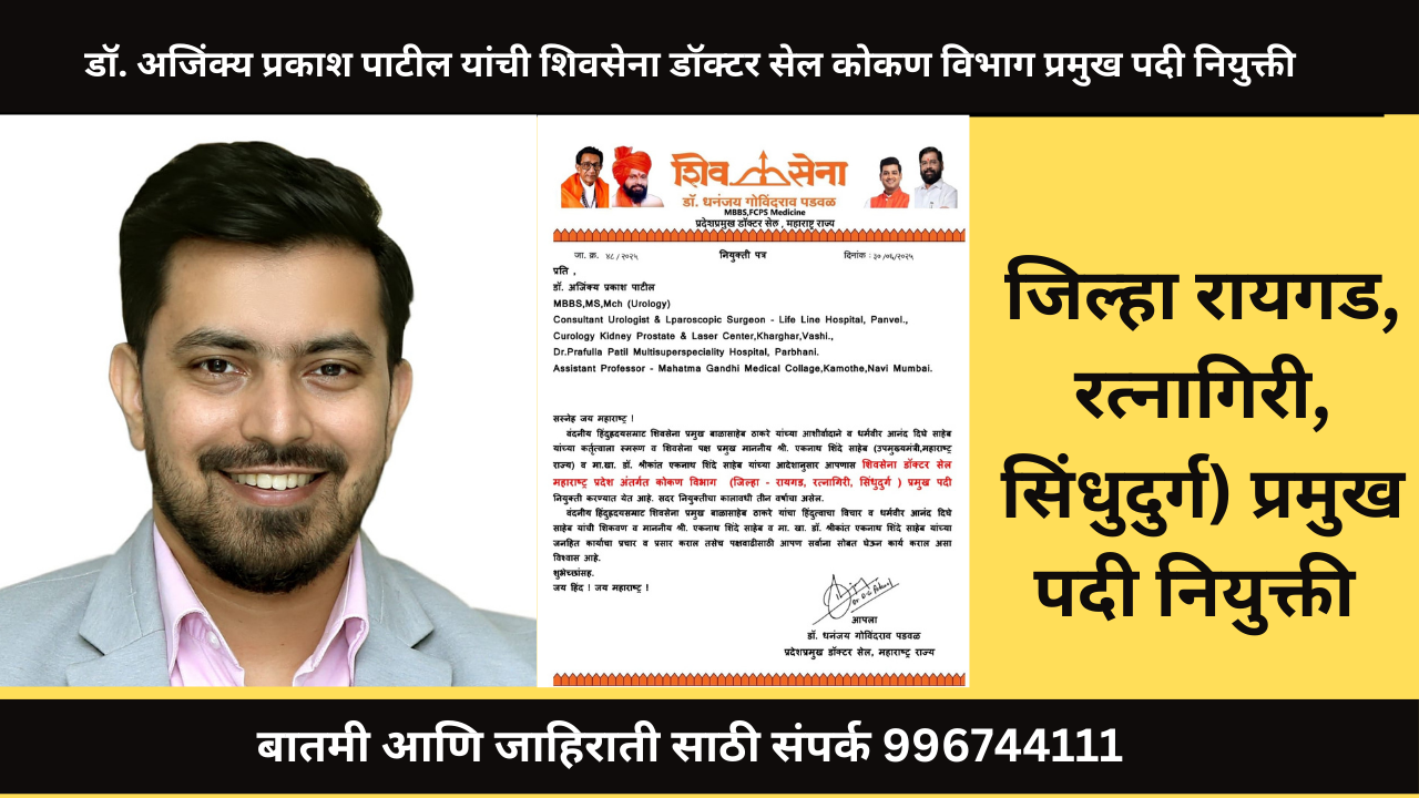 पनवेल दि. २८ ( संजय कदम ) : वंदनीय हिंदुहृदयसम्राट शिवसेना प्रमुख बाळासाहेब ठाकरे यांच्या आशीर्वादाने व धर्मवीर आनंद दिघे यांच्या कर्तृत्वाला स्मरूण तसेच शिवसेना पक्ष प्रमुख एकनाथ शिंदे (उपमुख्यमंत्री, महाराष्ट्र राज्य) व खा. डॉ. श्रीकांत एकनाथ शिंदे यांच्या आदेशानुसार डॉ. अजिंक्य प्रकाश पाटील यांची शिवसेना डॉक्टर सेल महाराष्ट्र प्रदेश अंतर्गत कोकण विभाग (जिल्हा रायगड, रत्नागिरी, सिंधुदुर्ग) प्रमुख पदी नियुक्ती करण्यात आली आहे .