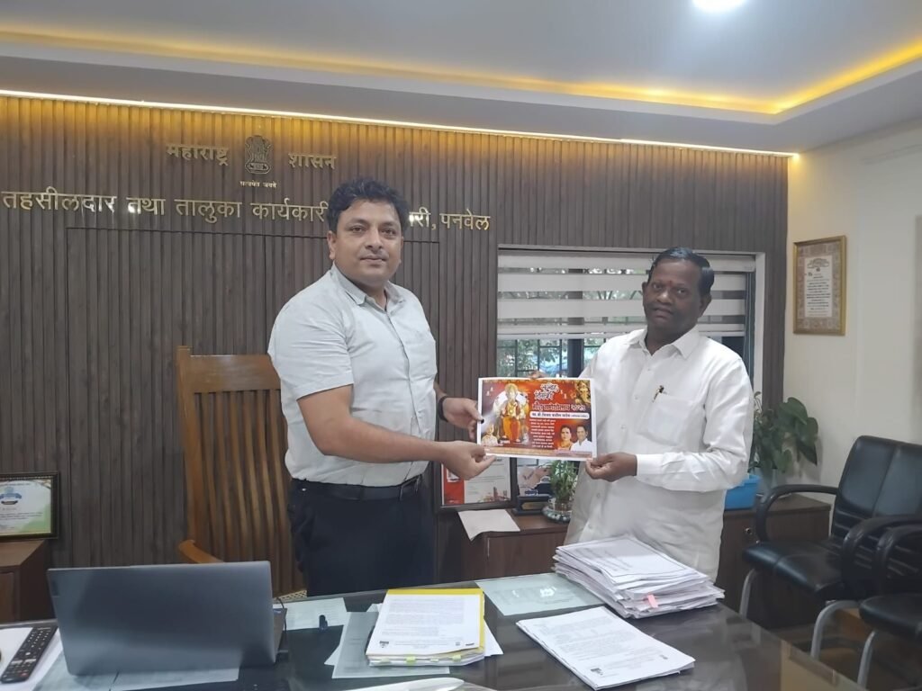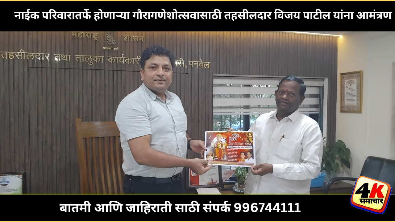 पनवेल दि.०6 (संजय कदम) : पनवेल चे तहसीलदार विजय पाटील यांना शिवसेना उरण तालुका संपर्कप्रमुख (उरण विधानसभा) बाळाराम नाईक व जिल्हा विकासमन्वयक व नियंत्रण (दिशा) समिती रायगड सदस्य व सरपंच पारगाव कोल्ही अहिल्याताई बाळाराम नाईक यांनी त्यांच्या निवासस्थानी विराजमान होणाऱ्या गौरागणेशोत्सव २०२५ चे निमंत्रण दिले.