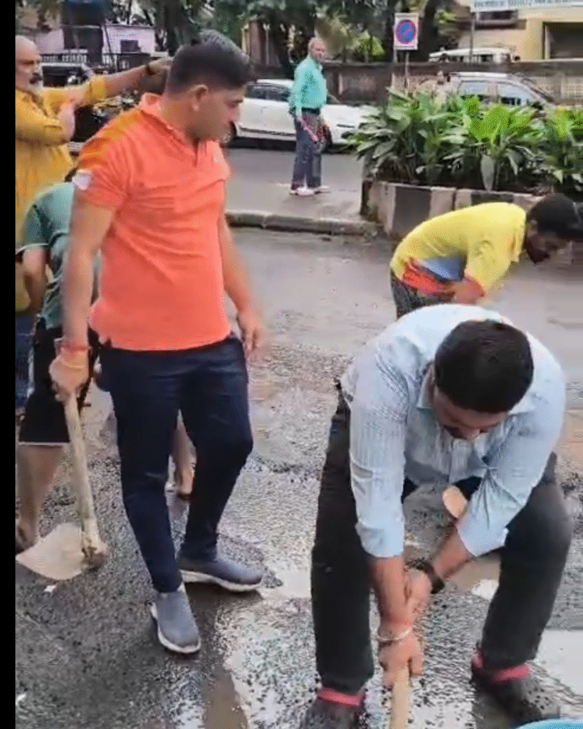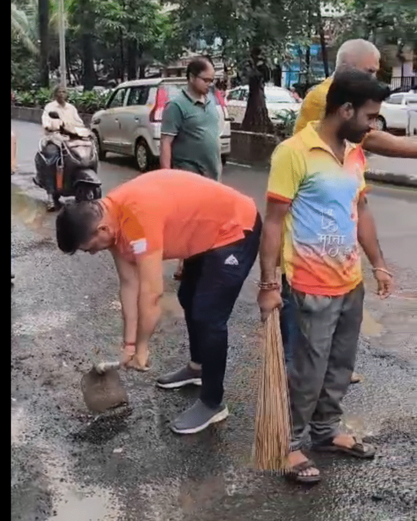 आज सकाळपासूनच कार्यकर्त्यांनी हातात फावडे, झाडू, टोपल्या घेऊन रस्त्यांवरील खड्डे बुजवण्याचे काम सुरू केले. पावसाची तमा न बाळगता नागरिकांच्या सुरक्षिततेसाठी हे काम करण्यात आले. काही ठिकाणी पाणी साचल्याने मोठ्या वाहनांना आणि दोनचाकी चालकांना अपघाताचा धोका निर्माण झाला होता. या पार्श्वभूमीवर हे अभियान नागरिकांसाठी दिलासा देणारे ठरले.