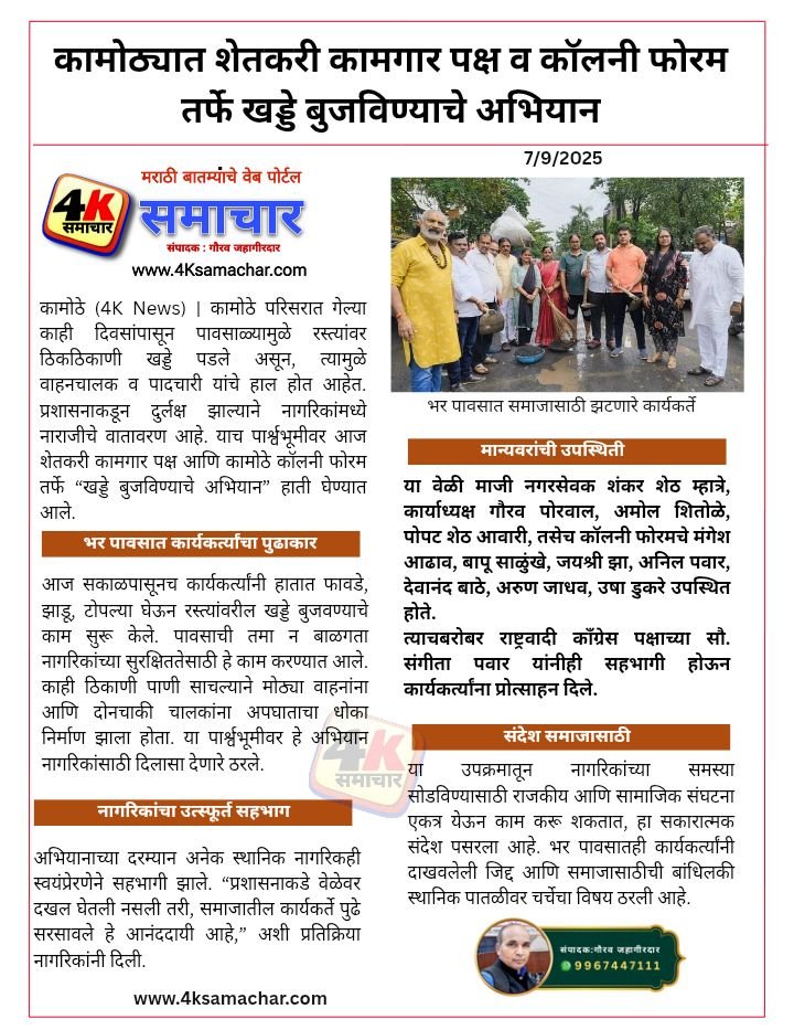 कामोठे (4K News) | कामोठे परिसरात गेल्या काही दिवसांपासून पावसाळ्यामुळे रस्त्यांवर ठिकठिकाणी खड्डे पडले असून, त्यामुळे वाहनचालक व पादचारी यांचे हाल होत आहेत. प्रशासनाकडून दुर्लक्ष झाल्याने नागरिकांमध्ये नाराजीचे वातावरण आहे. याच पार्श्वभूमीवर आज शेतकरी कामगार पक्ष आणि कामोठे कॉलनी फोरम तर्फे “खड्डे बुजविण्याचे अभियान” हाती घेण्यात आले.