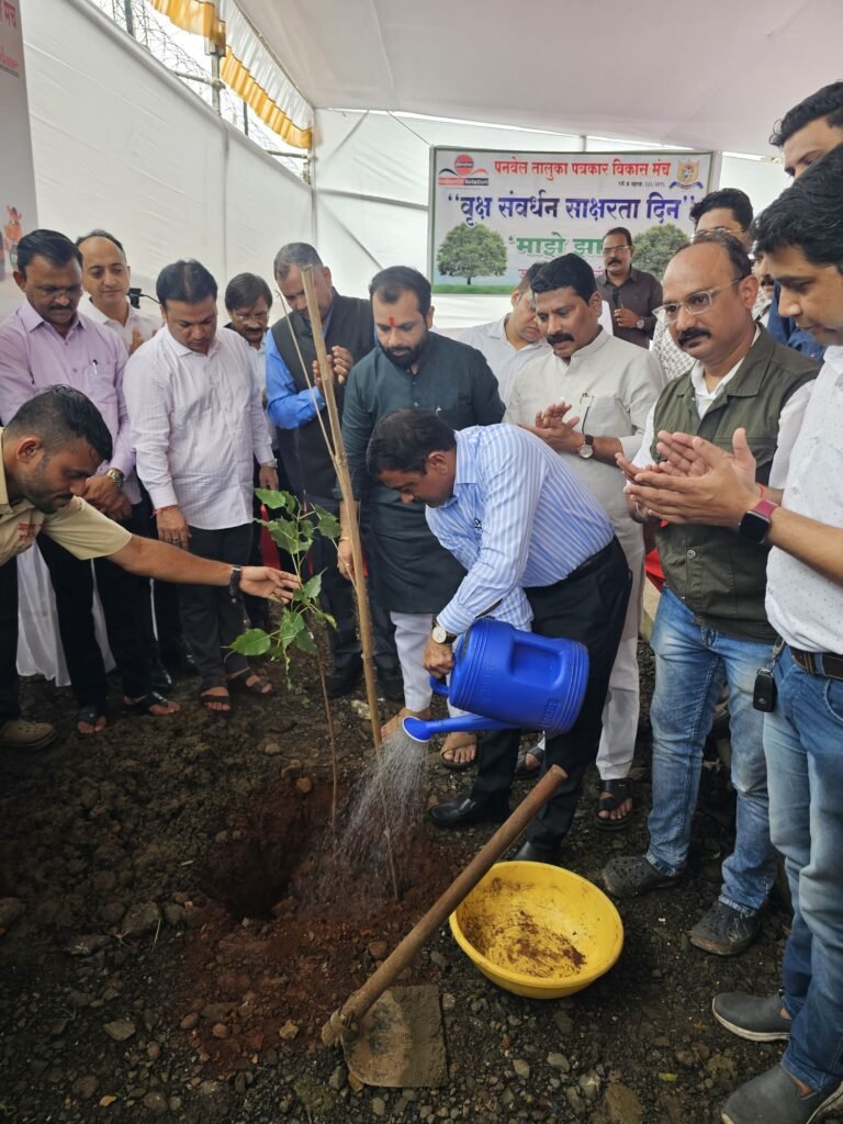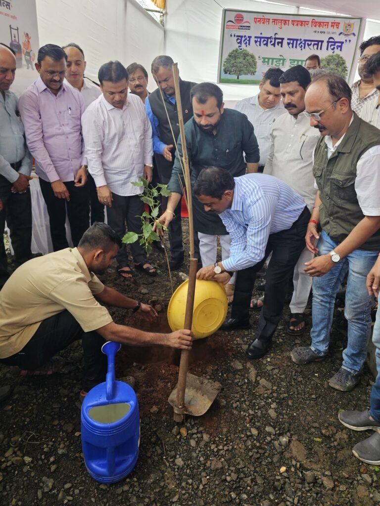 पनवेल(प्रतिनिधी) पनवेल तालुका पत्रकार मंचाच्या वतीने साक्षरता दिनाच्या औचित्याने वृक्ष संवर्धन साक्षरता दिनाचे आयोजन आज येथे करण्यात आले होते. इंडियन ऑइल, पनवेल तालुका पत्रकार विकास मंच आणि पनवेल महानगरपालिका यांच्या संयुक्त विद्यमान पार पडलेल्या या कार्यक्रमात आमदार प्रशांत ठाकूर यांच्या शुभहस्ते “माझे झाड” या उपक्रमाचा शुभारंभ करण्यात आला. या कार्यक्रमाला आमदार विक्रांत पाटील यांच्यासह अनेक मान्यवरांची प्रमुख उपस्थिती होती.