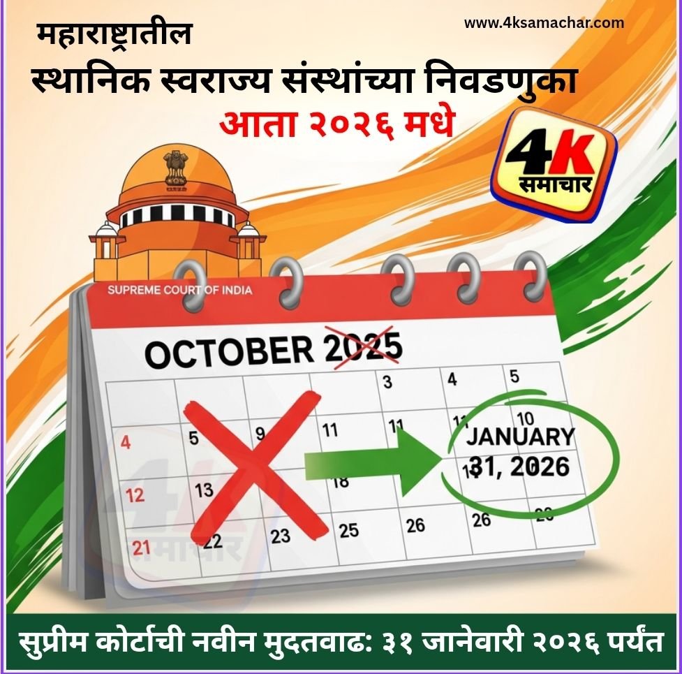नवी दिल्ली: (4Kसमाचार)गेल्या चार ते पाच वर्षांपासून प्रलंबित असलेल्या महाराष्ट्रातील स्थानिक स्वराज्य संस्थांच्या निवडणुका आता पुढील वर्षीच होणार असल्याचे स्पष्ट झाले आहे. निवडणूक आयोगाने सर्वोच्च न्यायालयात सादर केलेल्या मुदतवाढीच्या मागणीला न्यायालयाने मंजुरी दिली आहे. त्यानुसार, निवडणुकांसाठी 31 जानेवारी 2026 पर्यंत मुदतवाढ देण्यात आली असून, यानंतर पुन्हा मुदतवाढ मिळणार नाही, असेही न्यायालयाने स्पष्ट केले आहे.