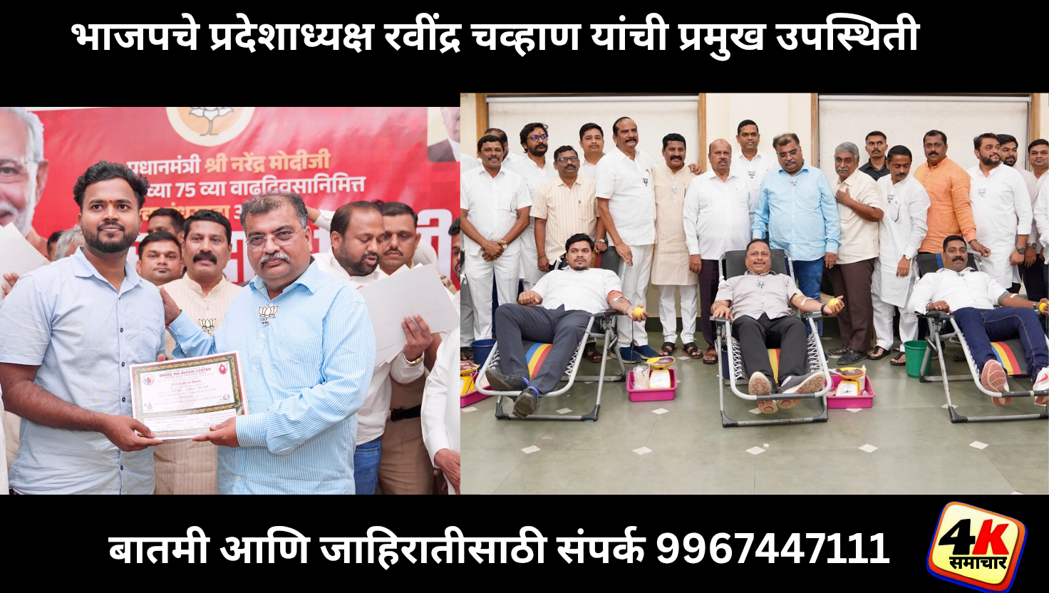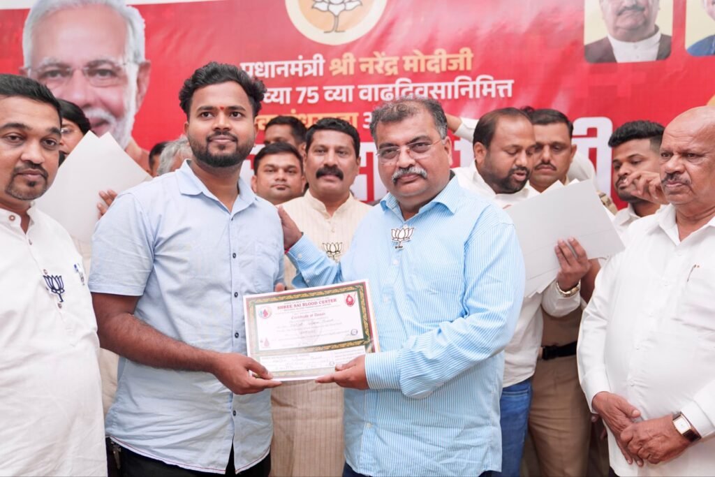 पनवेल (प्रतिनिधी) देशाचे लोकप्रिय पंतप्रधान नरेंद्र मोदी यांच्या अमृत महोत्सवी वर्ष वाढदिवसानिमित्त १७ सप्टेंबर ते ०२ ऑक्टोबर या कालावधीत भाजपच्या वतीने सेवा पंधरवडा आयोजित करण्यात आला असून या अंतर्गत स्वच्छता अभियान, रक्तदान शिबिर, आरोग्य तपासणी, नेत्र तपासणी, मोफत मोतीबिंदू शस्त्रक्रिया, चष्मे वाटप, मोदी विकास मॅरेथॉन, क्रीडा स्पर्धा अशा विविध सामाजिक उपक्रमांचे आयोजन करण्यात आले आहे. त्या अनुषंगाने आमदार प्रशांत ठाकूर व जिल्हाध्यक्ष अविनाश कोळी यांच्या मार्गदर्शनाखाली आज पनवेल मध्ये रक्तदान शिबिराचे आयोजन करण्यात आले होते. शहरातील मार्केट यार्डमधील श्री. रामशेठ ठाकूर सामाजिक विकास मंडळाच्या सभागृहात झालेल्या या शिबिराला प्रमुख पाहुणे म्हणून भाजपचे प्रदेश अध्यक्ष आमदार रविंद्र चव्हाण यांची प्रमुख उपस्थिती लाभली. .
