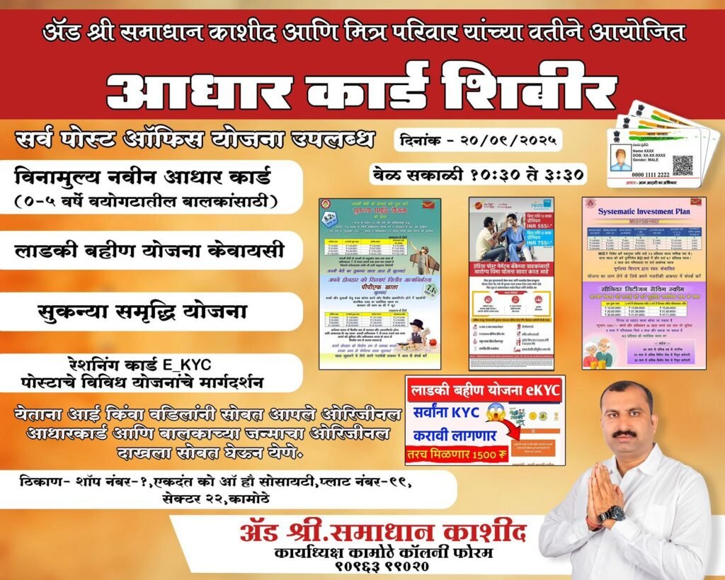 २० सप्टेंबर २०२५ रोजी सकाळी १०:३० ते दुपारी ३:३० या वेळेत मोफत आधार कार्ड शिबीर आयोजित करण्यात आलं आहे.