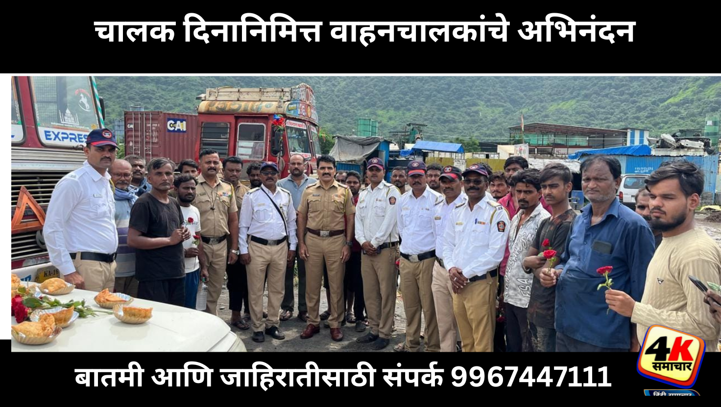 चालक दिनानिमित्त पनवेल शहर वाहतूक शाखा हद्दितील पळस्पे ते टी पॉइंट दरम्यान निलेश ढाबा येथील जेएनपीटी मुख्य पॉईंटवर वाहन चालकना त्यांच्या कर्तव्या बाबत वाहतूक विभागामार्फत त्यांची प्रशंसा व गुलाबाचे फुल, अल्पोपहार देऊन अभिनंदन करून भविष्यात त्यांनी अशाच प्रकारे आपले कर्तव्य जबाबदारीने करावे याबाबत मार्गदर्शन केले. यावेळी प्रभारी अधिकारी वपोनि औदुंबर पाटील यांच्यासह वाहतूक अंमलदार तसेच वाहनचालक मोठ्यासंख्येने उपस्थित होते.