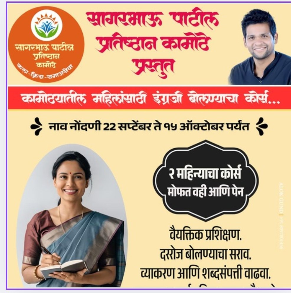 कामोठ्यातील मुली आणि महिलांसाठी खास तयार करण्यात आलेल्या या इंग्रजी बोलण्याच्या कोर्सद्वारे केवळ भाषा शिकवली जाणार नाही, तर आत्मविश्वास, संवादकौशल्य आणि व्यक्तिमत्त्व विकासालाही चालना मिळणार आहे.
