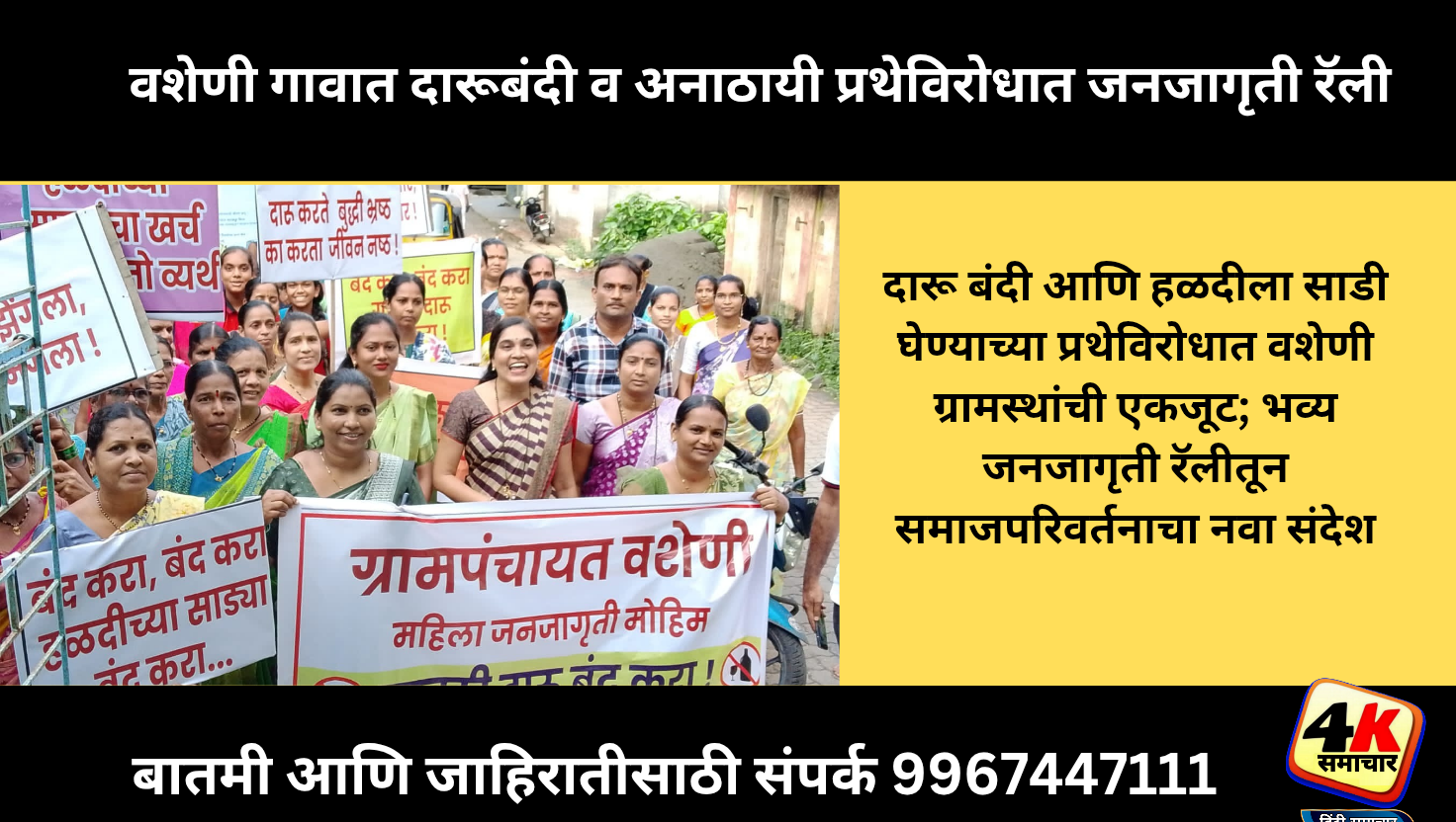 उरण तालुक्यातील वशेणी गावात वाढत्या सामाजिक समस्या आणि अनावश्यक प्रथा थांबविण्यासाठी वशेणी गावात भव्य जनजागृती रॅली काढण्यात आली. दारूबंदी तसेच हळदीला साडी घेण्याची प्रथा बंद करण्यासाठी ही रॅली आयोजित करण्यात आली होती. रॅलीत ग्रामस्थ, महिला मंडळ, युवक मंडळ तसेच शालेय विद्यार्थी मोठ्या संख्येने सहभागी झाले होते. “दारूबंदी करा – समाज वाचवा”, “अनाठायी प्रथा बंद करा – समाजाला नवा दिशा द्या” अशा घोषणा देत रॅलीतून जनतेला संदेश देण्यात आला.