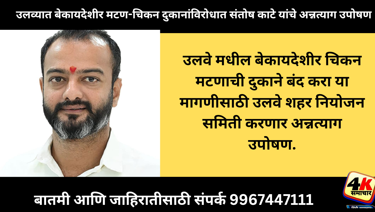 उलवेत बेकायदा चिकन मटणच्या दुकानाकडे स्थानिक प्रशासनाकडून दुर्लक्ष केले जात असल्याने, चिकन मटण विक्रेत्यांनी शाळा, कॉलेज, मंदिरे, चौक, महत्वाचे रस्ते, कॉर्नर रस्त्यावर तर कुठे गटारावर आपली दुकाने सुरु केली आहेत. त्यामुळे नागरिकांचे तसेच विविध पशु पक्ष्यांचेही अस्तित्व, जीवनमान, आरोग्य धोक्यात आले आहे. अशा दुकानांवर कारवाई करावी, यासाठी २२ सप्टेंबर २०२५ ते ३० सप्टेंबर २०२५ दरम्यान श्री छत्रपती शिवाजी महाराज चौक, सेक्टर १९, उलवे शहर, पनवेल तालुका, जिल्हा रायगड येथे उलवे शहर नियोजन समितीच्या माध्यमातून संतोष काटे हे अन्नत्याग उपोषण करणार आहेत.