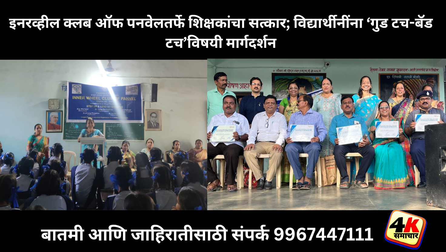 पनवेल (प्रतिनिधी) इनरव्हील क्लब ऑफ पनवेल तर्फे आद्य क्रांतिवीर वासुदेव बळवंत फडके माध्यमिक विद्यालय येथे विद्यालयातील गुणवंत शिक्षकांना प्रशस्तीपत्र, भेटवस्तू व मिठाई देऊन सन्मानित करण्यात आले. क्लब सीपीसी सुलभा निंबाळकर यांनी इयत्ता पाचवी ते आठवीच्या विद्यार्थिनींसाठी ‘गुड टच बॅड टच’ या विषयावर मार्गदर्शन केले तसेच या विद्यालयातील चित्रकला विषयाच्या स्पर्धा परीक्षा देणाऱ्या विद्यार्थ्यांसाठी.