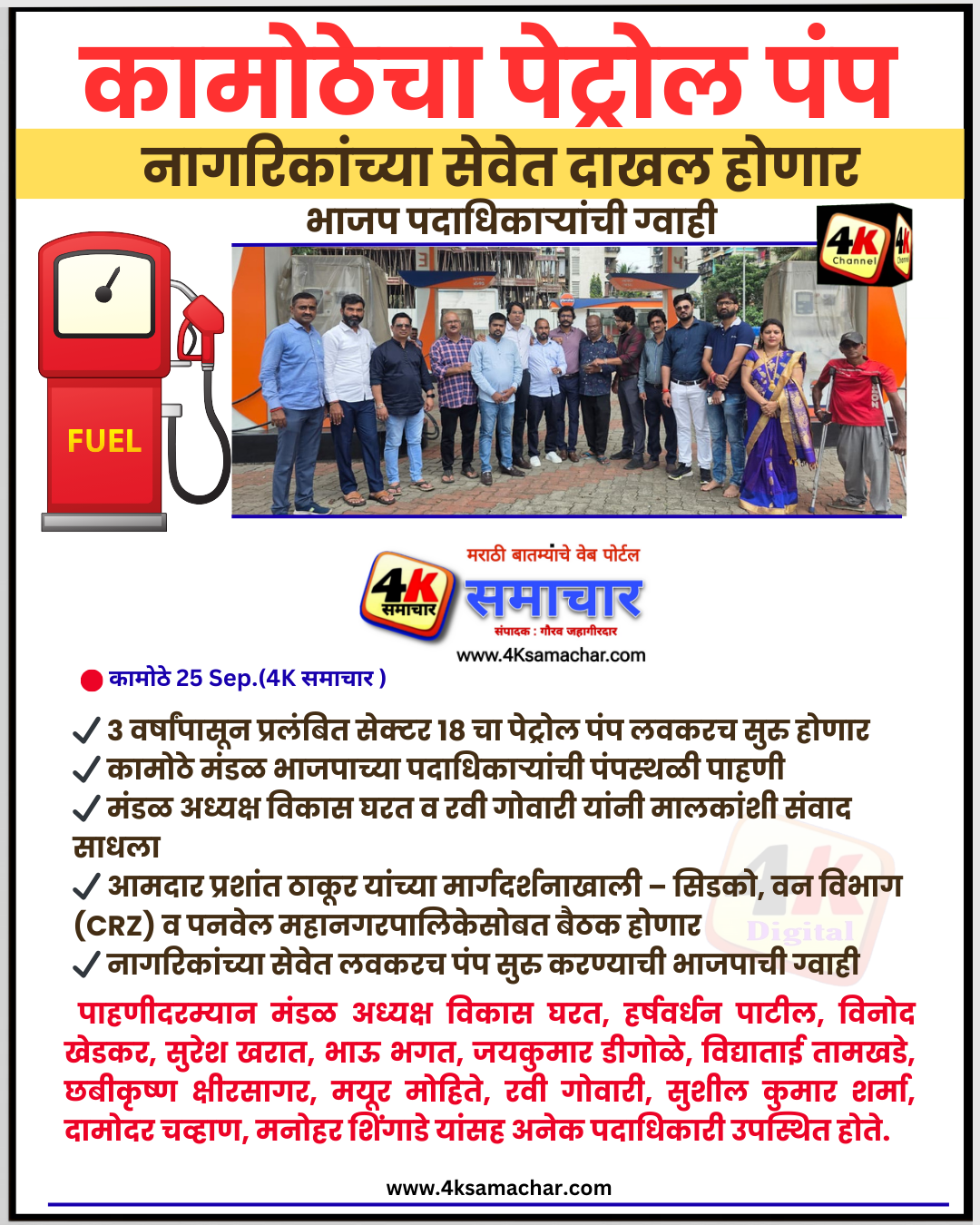 कामोठे :25 Sep (4K समाचार)आज कामोठे मंडळ भाजपाच्या सर्व पदाधिकाऱ्यांनी या पेट्रोल पंपाची पाहणी करून थेट मालकांशी संपर्क साधला. मंडळ अध्यक्ष विकास घरत व समाजसेवक रवी गोवारी यांनी पंप मालकांशी दूरध्वनीवर संवाद साधत अडचणी जाणून घेतल्या.