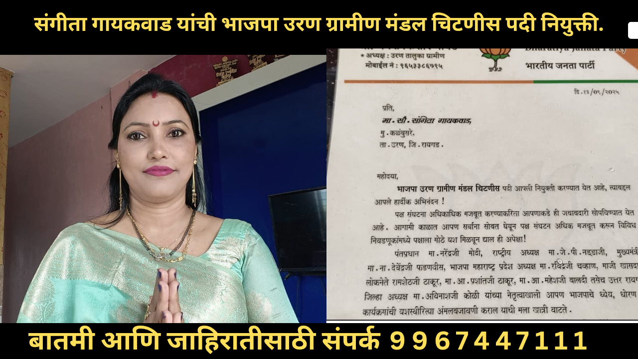 भारतीय जनता पार्टीचे विचार व कार्य तळागाळात पोहोचावे, पक्षाच्या माध्यमातून जनतेला जास्तीत जास्त न्याय देता यावा या अनुषंगाने तसेच संगीता रवींद्र गायकवाड या भारतीय जनता पार्टीच्या कट्टर एकनिष्ठ व प्रामाणिक कार्यकर्त्या असल्याने त्यांची निवड भाजपा उरण ग्रामीण मंडल चिटणीस पदी करण्यात आली आहे. संगीता गायकवाड यांची निवड उरण ग्रामीण मंडल चिटणीस पदी झाल्याने त्यांच्या या निवडीचे सर्वत्र स्वागत करण्यात येत असून त्यांच्यावर सर्वच स्तरातून शुभेच्छा व अभिनंदनाचा वर्षाव होत आहे.सर्वांचे आभार मानत त्यांनी आपल्या भावना व्यक्त केल्या.भाजपा उरण ग्रामीण मंडल चिटणीस पदी माझी नियुक्ती करण्यात आली आहे त्याबद्दल मी पक्षाच्या सर्वच पदाधिकारी कार्यकर्त्यांचे आभार मानते.पक्ष संघटना अधिकाधिक मजबूत करण्याकरिता माझ्याकडे ही जबाबदारी सोपविण्यात आली आहे..