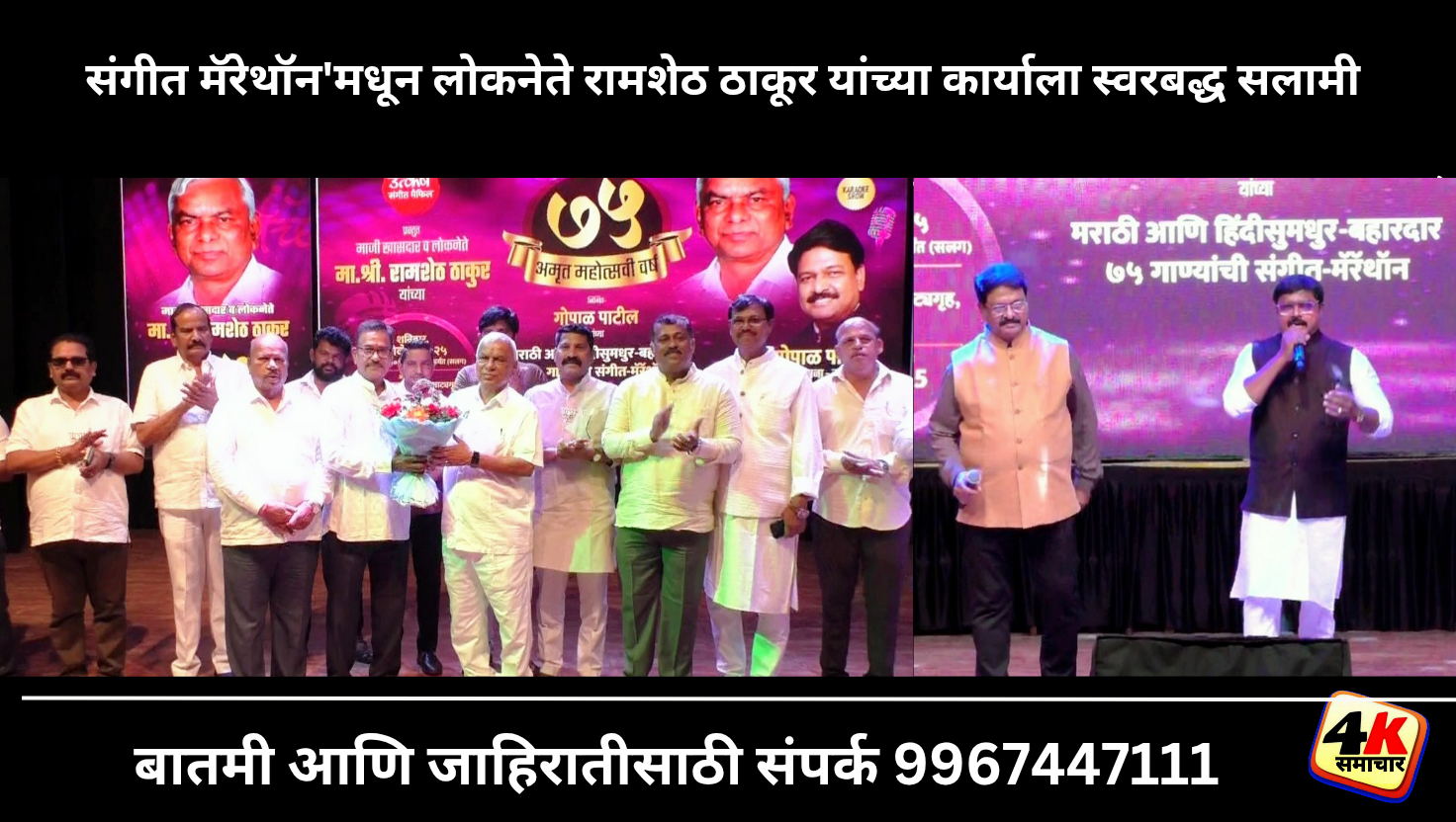 राजकारणापेक्षा समाजकारणाला अधिक प्राधान्य देणारे, जनतेच्या मनात घर करणारे लोकनेते रामशेठ ठाकूर हे एक थोर समाजसेवक म्हणून ओळखले जातात. गेल्या पाच दशकांहून अधिक काळ त्यांनी सामाजिक कार्याची अखंड परंपरा जपली असून आजही ती तितक्याच जोमाने त्यांचे सामाजिक सुरू आहे. त्यामुळे या कार्यक्रमात लोकनेते रामशेठ ठाकूर याचे अखंड सामाजिक कार्य अधोरेखित करण्यात आले. गायक गोपाळ पाटील यांच्या संकल्पनेतून हा भव्य कार्यक्रम पनवेलमधील आद्य क्रांतिवीर वासुदेव बळवंत फडके नाट्यगृह येथे आयोजित करण्यात आला होता. या संगीत मॅरेथॉन मध्ये सकाळी ११.३० वाजल्यापासून सलग साडेसात तास मराठी व हिंदी गाण्यांचे सादरीकरण झाले. गायक गोपाळ पाटील यांच्यासह उरण, पनवेल आणि नवी मुंबई येथील ७५ गायकांनी गाण्याचे सादरीकरणे केले. या कार्यक्रमाचा शुभारंभ प्रमुख मान्यवर म्हणून लोकनेते रामशेठ ठाकूर यांच्या हस्ते करण्यात आला. व्यासपीठावर आगमनाच्या वेळी गायक रवी नाईक यांनी ‘रामजी की निकली सवारी’ हे गाणे सादर केले. त्या सुरेल सादरीकरणाच्या पार्श्वभूमीवर उपस्थितांनी लोकनेते रामशेठ ठाकूर यांच्यावर पुष्पवृष्टी करत उत्स्फूर्त स्वागत केले.यावेळी प्रमुख पाहुणे म्हणून भाजपचे ज्येष्ठ नेते माजी नगराध्यक्ष जे. एम. म्हात्रे, भाजपचे उत्तर रायगड जिल्हाध्यक्ष अविनाश कोळी, भाजपचे राज्य परिषद सदस्य अरुणशेठ भगत, ज्येष्ठ नेते वाय. टी. देशमुख, जिल्हा सरचिटणीस नितीन पाटील, ऍड. प्रकाश बिनेदार, दीपक बेहेरे, चंद्रकांत घरत, रविनाथ पाटील, ब्रिजेश पटेल, नरसू पाटील, एकनाथ ठाकूर, नरेश रहाळकर, भाजपचे खारघर मंडल अध्यक्ष प्रवीण पाटील, पूर्व मंडल अध्यक्ष भूपेंद्र पाटील, माजी नगरसेवक रविंद्र भगत, ऍड. नरेश ठाकूर, माजी नगरसेविका प्रमिला पाटील, सिमा घरत, माजी जिल्हा परिषद सदस्य अमित जाधव, समीर कदम, दीपक शिंदे, सांस्कृतिक सेलचे जिल्हाध्यक्ष अभिषेक पटवर्धन यांच्यासह रसिक प्रेक्षक मोठ्या संख्येने उपस्थित होते.
