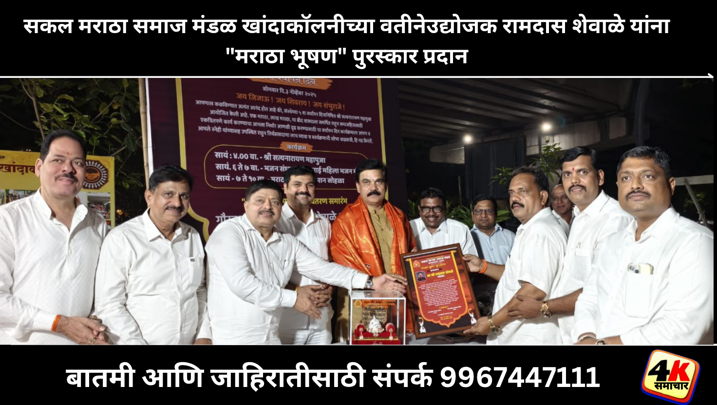 पनवेल दि.०६ (वार्ताहर) : सामाजिक, शैक्षणिक आणि उद्योजकीय क्षेत्रात उल्लेखनीय कार्य करून मराठा समाजाचे नाव उज्ज्वल करणाऱ्या रायगड जिल्ह्यातील जनसेवक उद्योजक मा. रामदास शेवाळे यांना यावर्षीचा ‘मराठा भूषण’ पुरस्कार प्रदान करण्यात आला. हा पुरस्कार सकल मराठा समाज मंडळ, खांदा कॉलनी, पनवेल यांच्या वतीने संस्थेच्या पाचव्या वर्धापन दिनानिमित्त आयोजित सोहळ्यात प्रदान करण्यात आला.