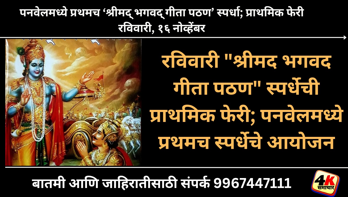 पनवेल (प्रतिनिधी) भारतीय जनता पार्टी पनवेल तालुका, संस्कार भारती पनवेल महानगर, संस्कृत भारती पनवेल आणि श्री गुरुकुलम न्यास यांच्या संयुक्त विद्यमाने आयोजित करण्यात आलेल्या “श्रीमद भगवद गीता पठण” स्पर्धेची प्राथमिक फेरी रविवार दिनांक १६ नोव्हेंबर रोजी विभागनिहाय पनवेल, नवीन पनवेल, कामोठे आणि खांदा कॉलनी येथे आयोजित करण्यात आली आहे. विशेष म्हणजे प्रथमच अशा स्पर्धेचे आयोजन पनवेलमध्ये करण्यात आले आहे.