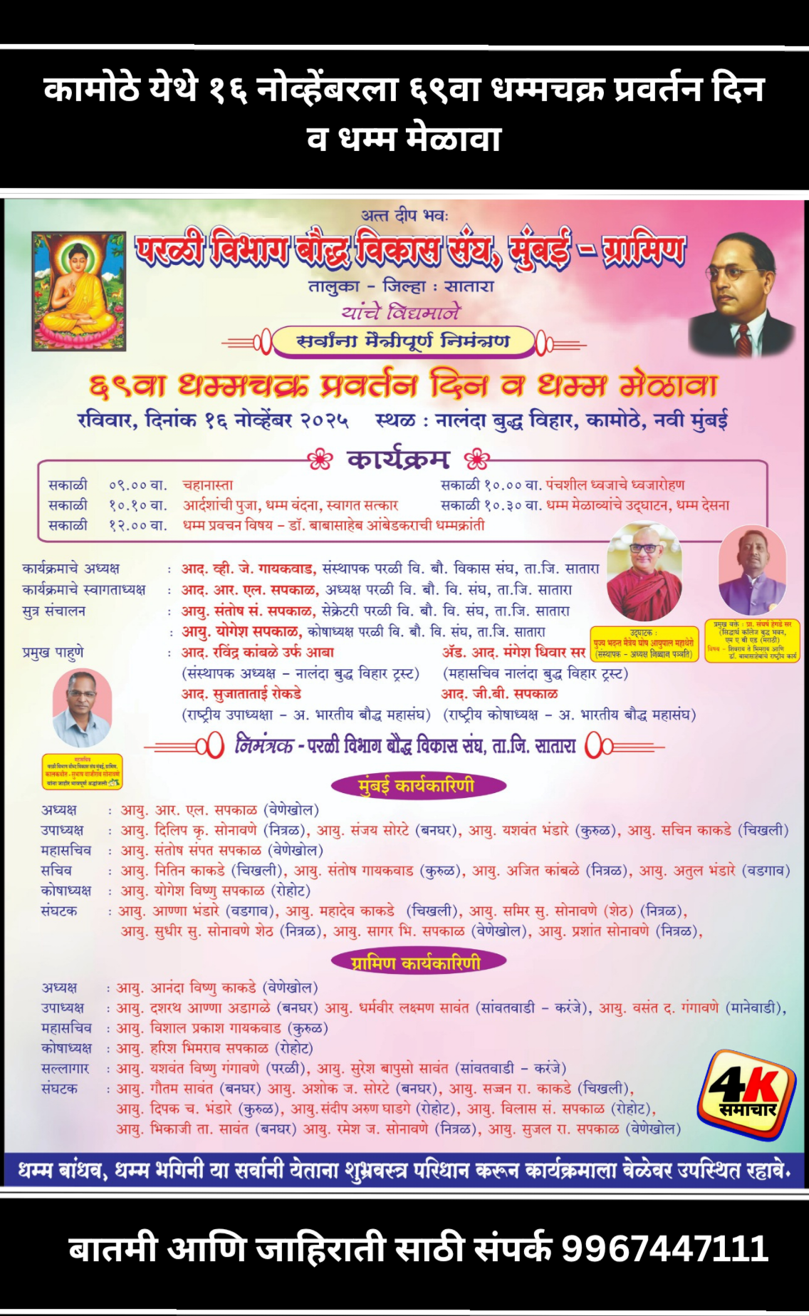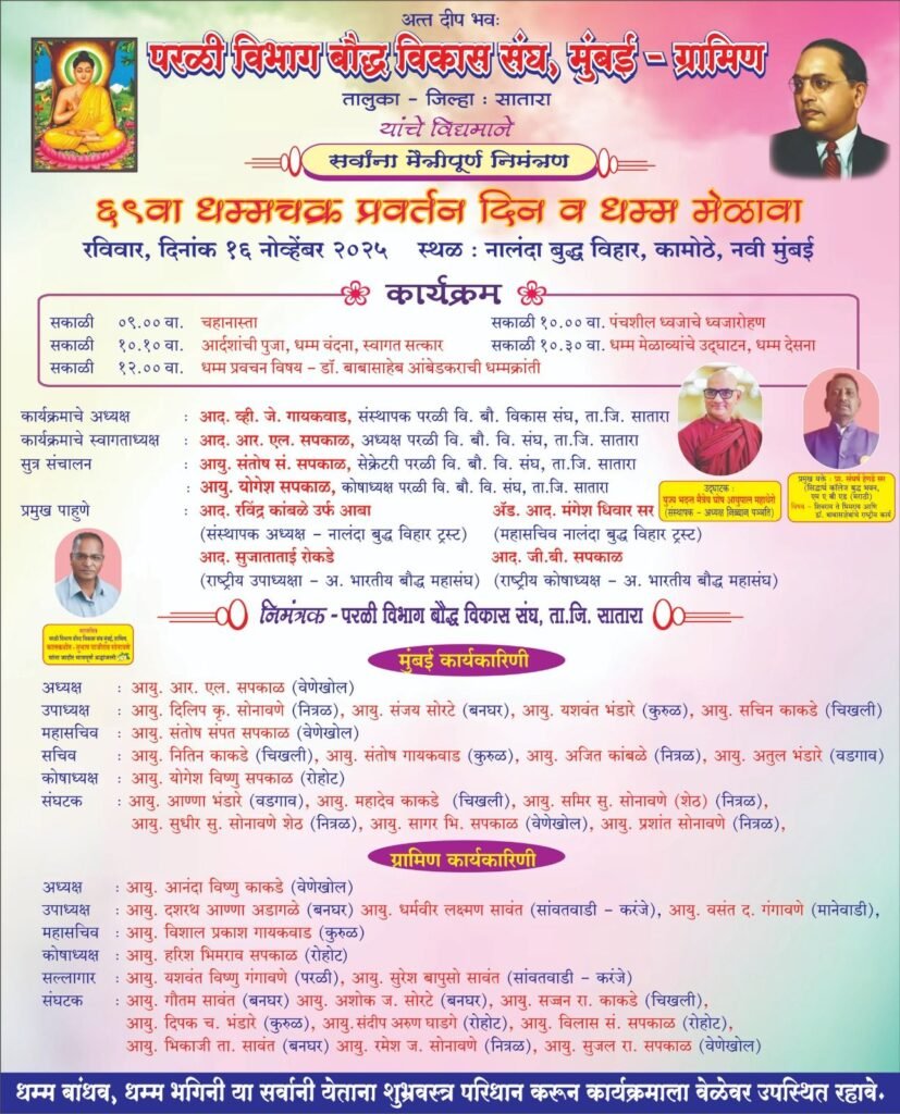 कामोठे, नवी मुंबई : परळी विभाग बौद्ध विकास संघ, मुंबई–ग्रामीण (ता.–जि. सातारा) यांच्या विद्यमाने ६९वा धम्मचक्र प्रवर्तन दिन व धम्म मेळावा रविवार, १६ नोव्हेंबर २०२५ रोजी नालंदा बुद्ध विहार, कामोठे येथे आयोजित करण्यात आला आहे. धम्म बांधव व भगिनींनी शुभ्रवस्त्र परिधान करून वेळेवर कार्यक्रमाला उपस्थित राहण्याचे आवाहन करण्यात आले आहे.